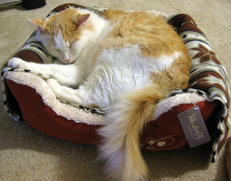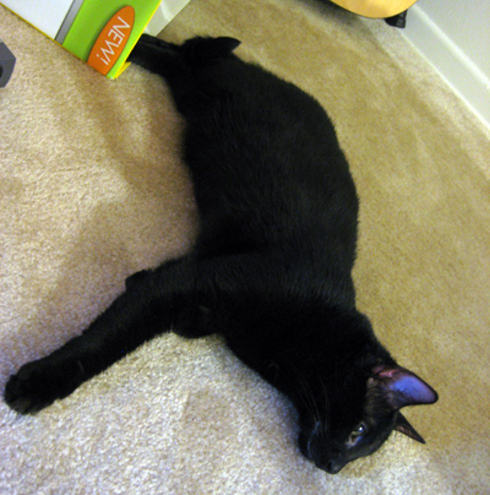 Our cat, Shadow is not a big fan of cat beds because he likes human beds or the carpet better. Here is a picture of him lounging on the floor, stretched out completely relaxed.