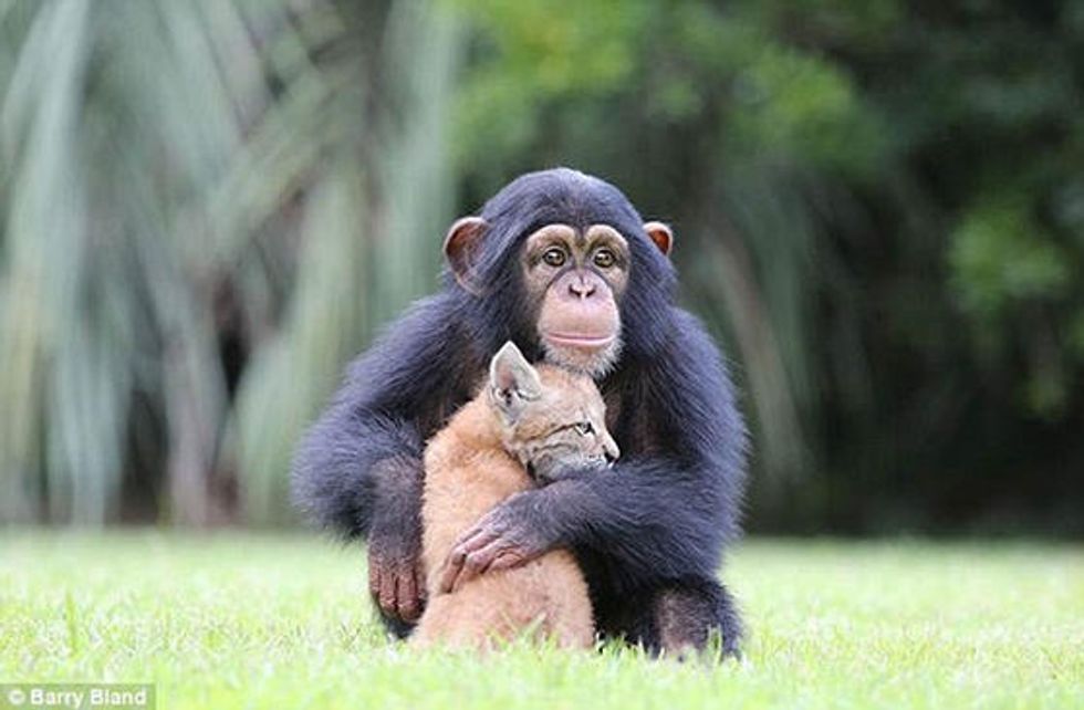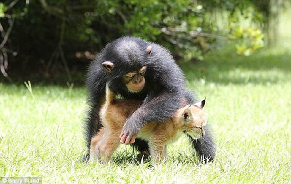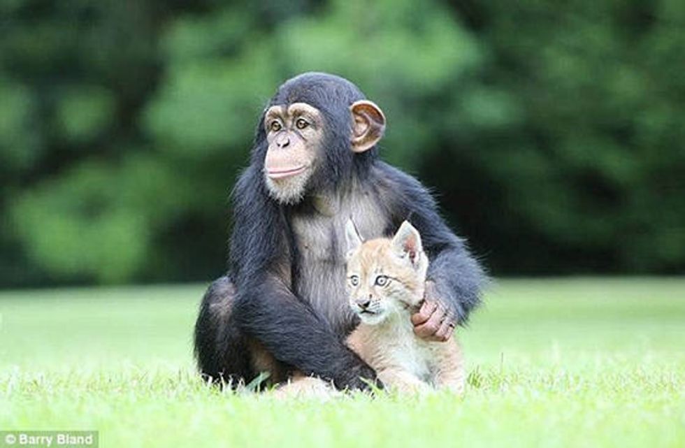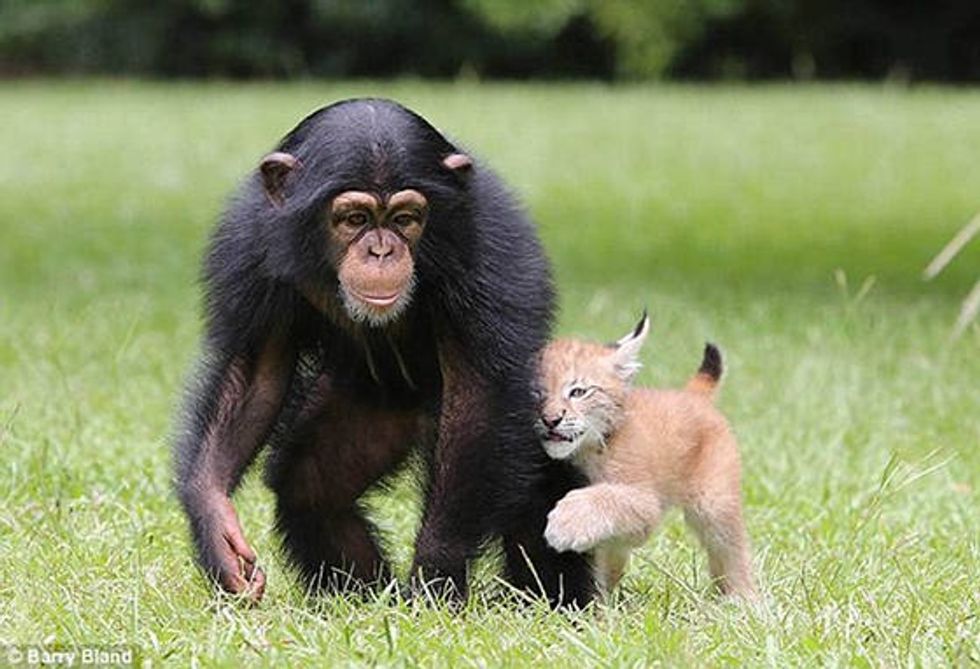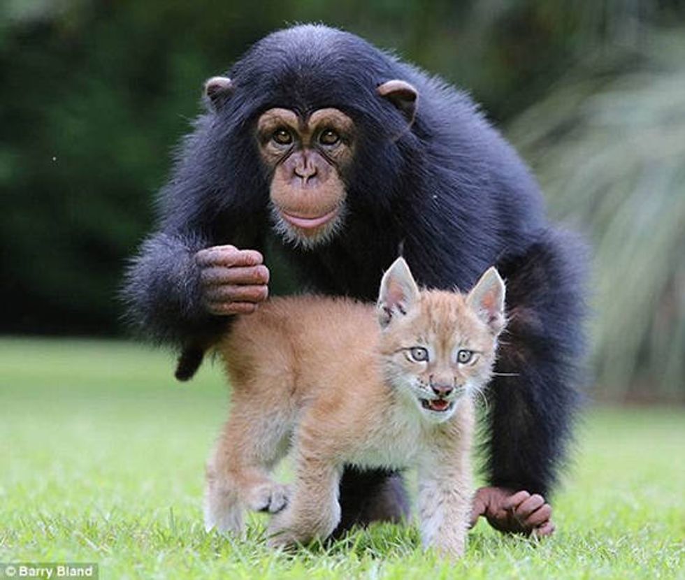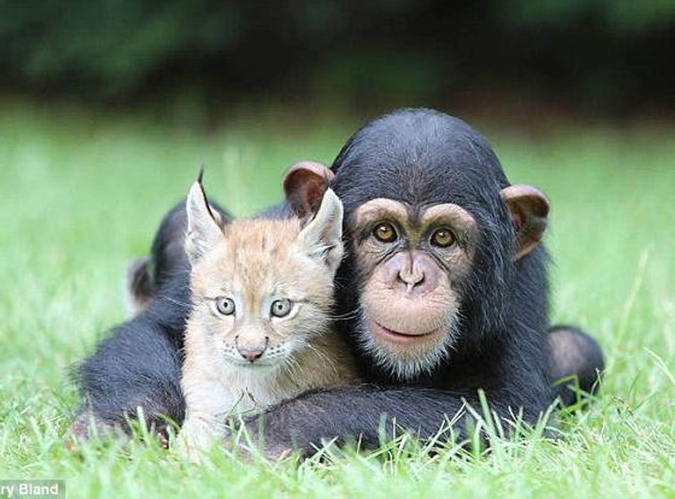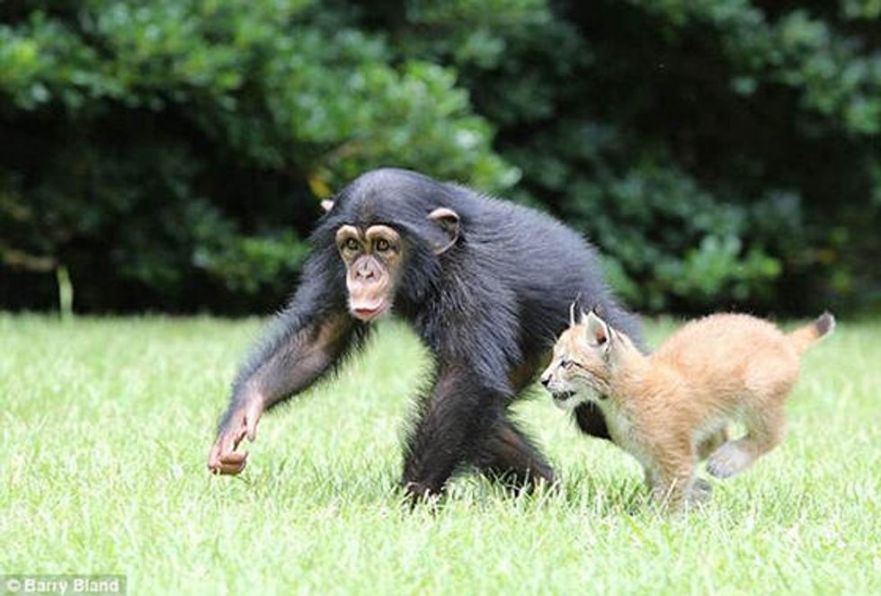 Sutra, a 9 week old Lynx (wildcat) and Varil, a 20 month old chimpanzee share very special friendship