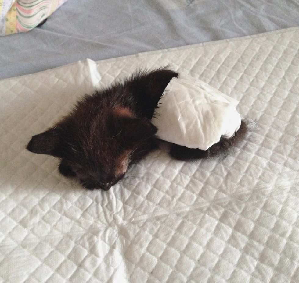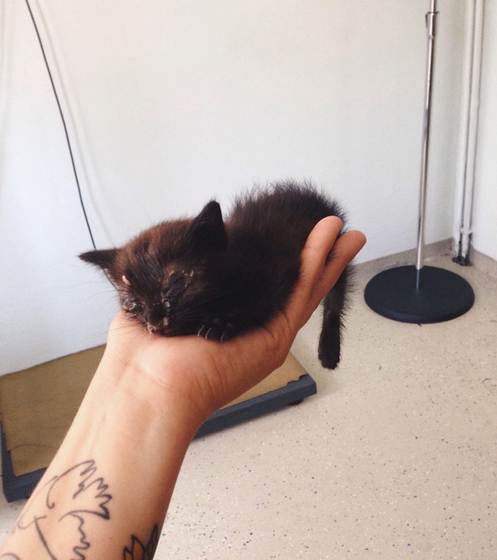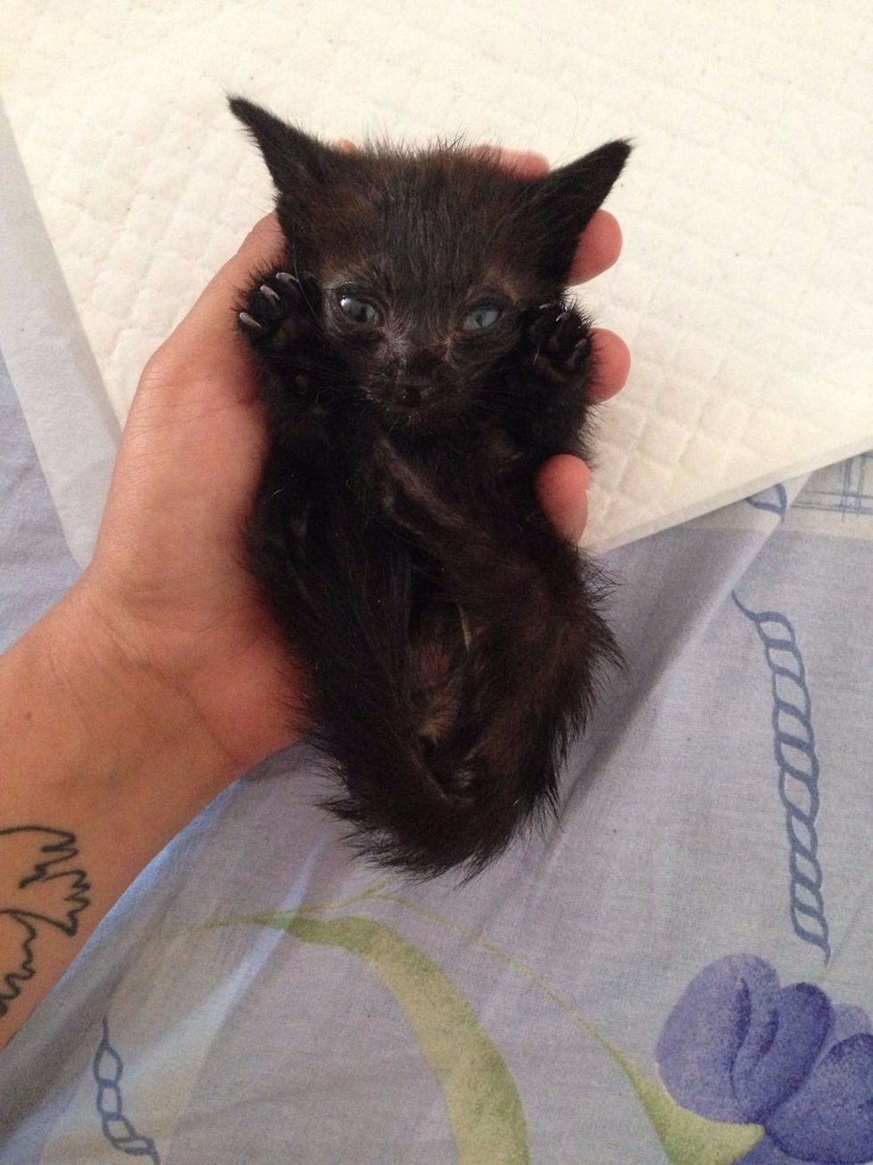 The tiny kitten was covered in fleas, had a couple broken bones and an infected eye. After several baths, she was finally on the mend.