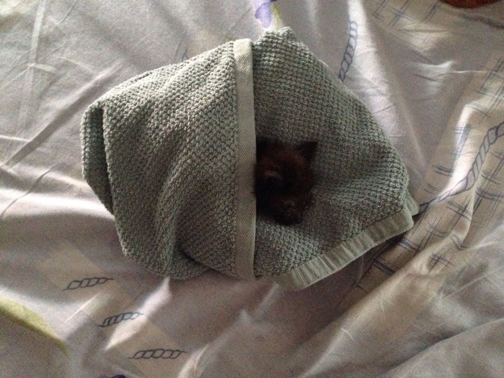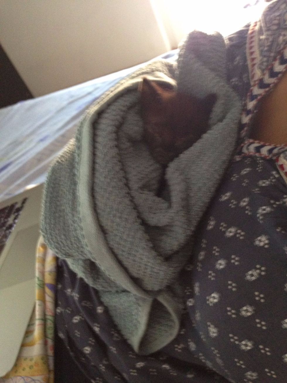 She's caring for the little kitten, nursing her back to health until she can find her a good home.