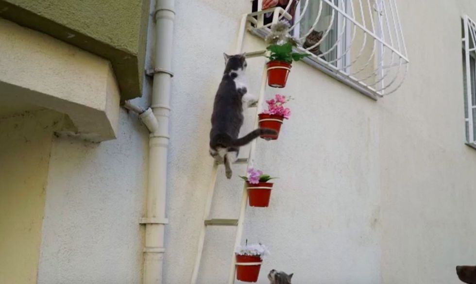 One of the stray cats climbs up the ladder to meet his caregiver.