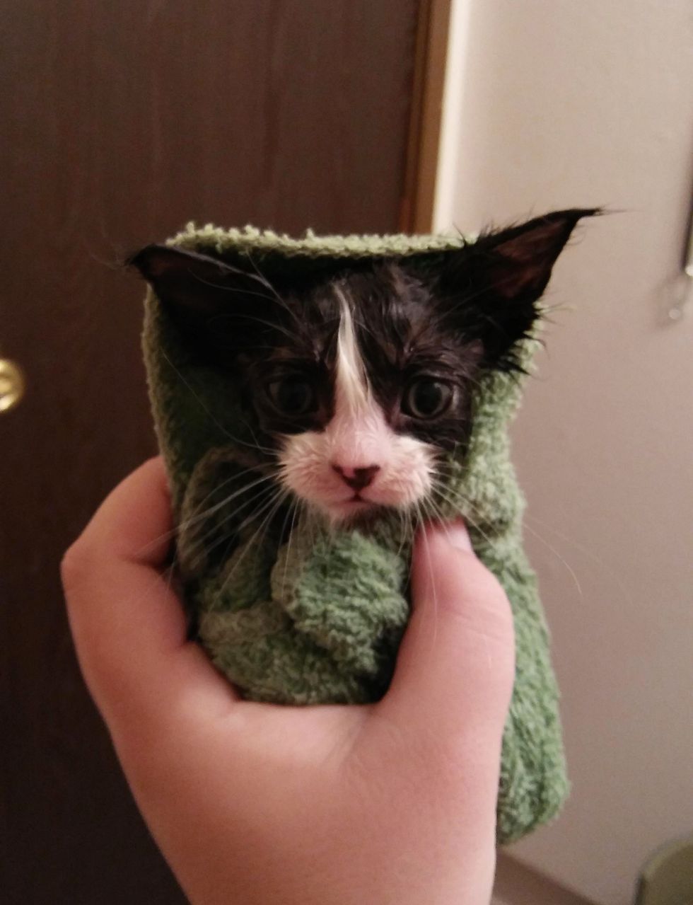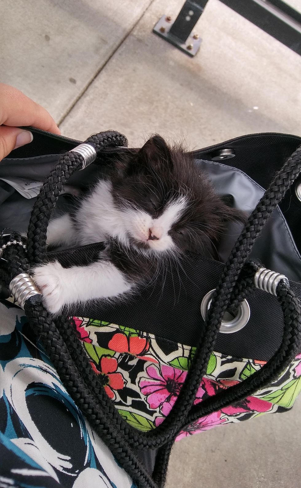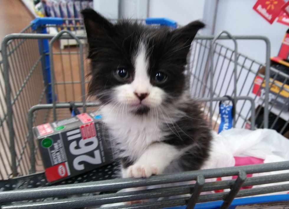The other kitten needed medical attention and help from an animal rescue but the tiny tuxedo was playful, healthy, and as soon as Kayla put her in her arms, she turned into a cuddly fluff ball.