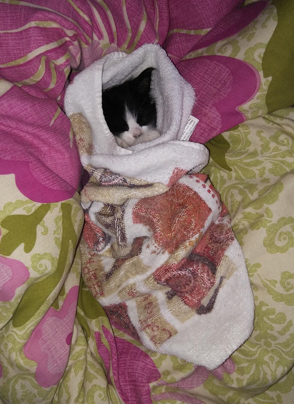 After a bath and a big dinner, the kitten fell asleep like a purrito.