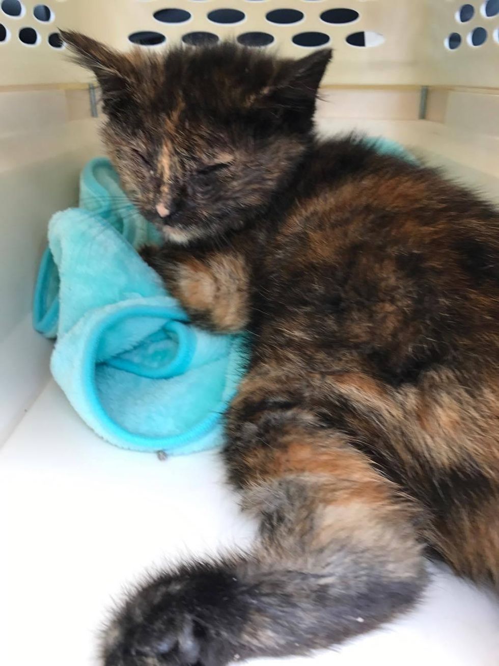 There was busy traffic right next to the kitten who was stranded and frightened . As Kelley made her way to the kitten and said, "It's all right baby," the kitten responded by lifting up her head, a sign of life that brought hope to Kelley. She Immediately scooped her in a blanket and placed her in a carrier.