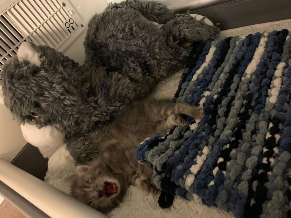 24 hours later, Harvey was able to open his eyes and regain his vision without all the gunk and crust. He was placed in an incubator to help regulate his body temperature and given a cuddle toy so he wouldn't feel alone during bed time.