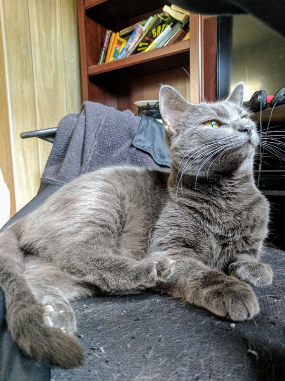 "At this very moment she's meowing gently and rubbing her face into my leg because she just finished her food and wants more and knows I'm a sucker for flattery."