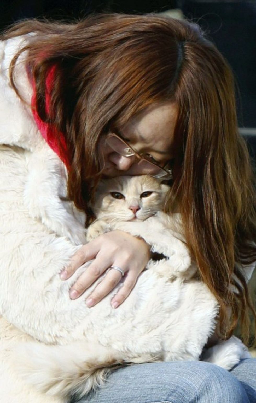 A woman sleeps with a cat at an evacuation center in Kawamatamachi, Fukushima Prefecture Sunday morning, March 13, 2011, two days after a strong earthquake and tsunami hit northeastern Japan. (AP Photo/The Yomiuri Shimbun, Kazuki Wakasugi)