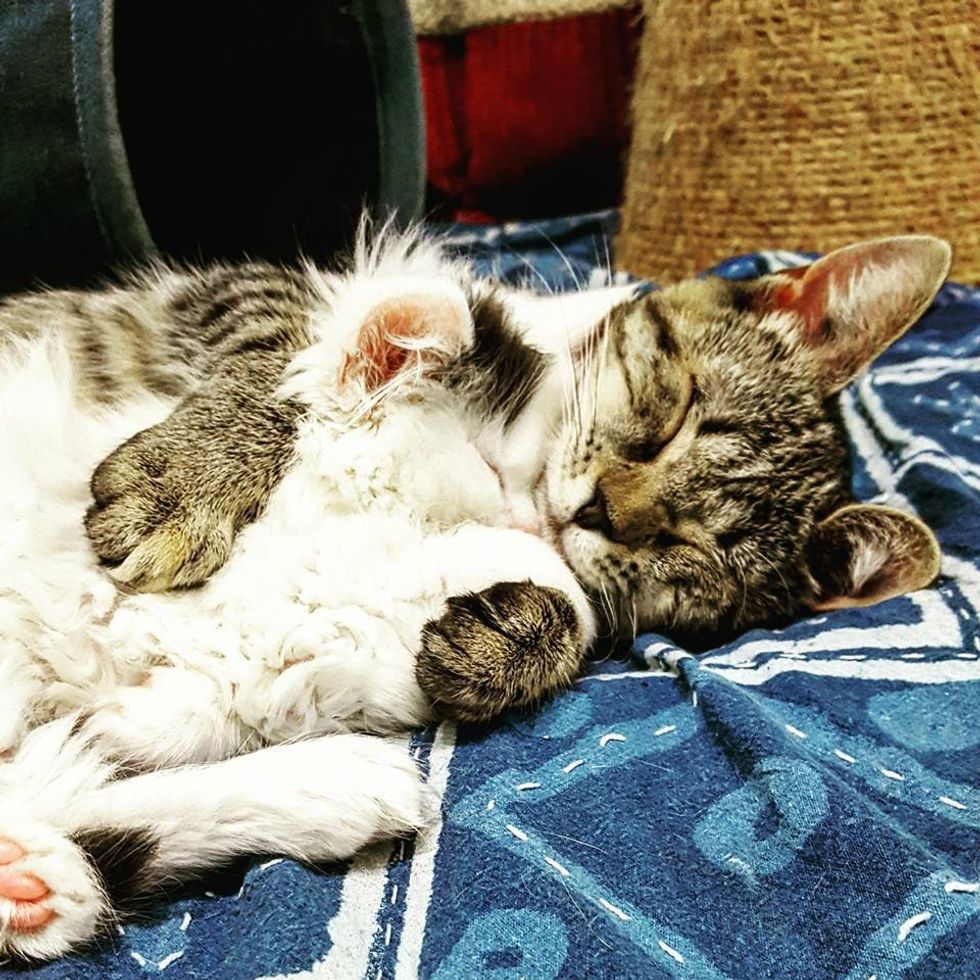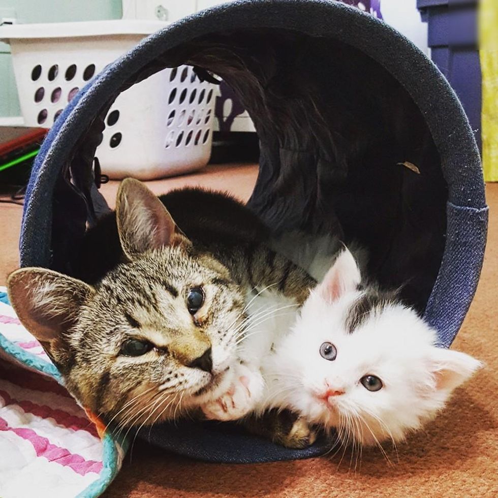 Melon, a resident cat (fostered and adopted by Sarah), took to little Winks right away, and they began to snuggle.