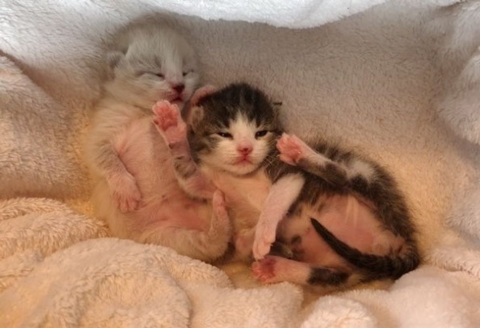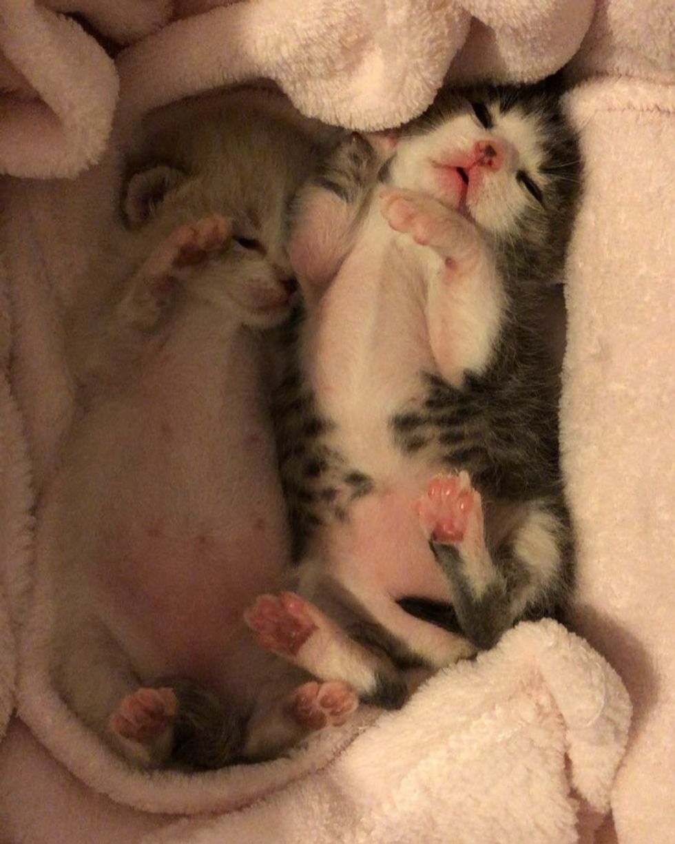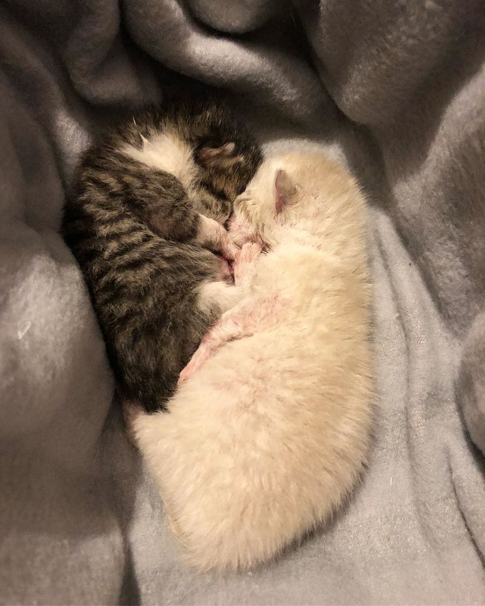 "When the kitten arrived, we put him with his sister, and they immediately started to cuddle together for warmth."