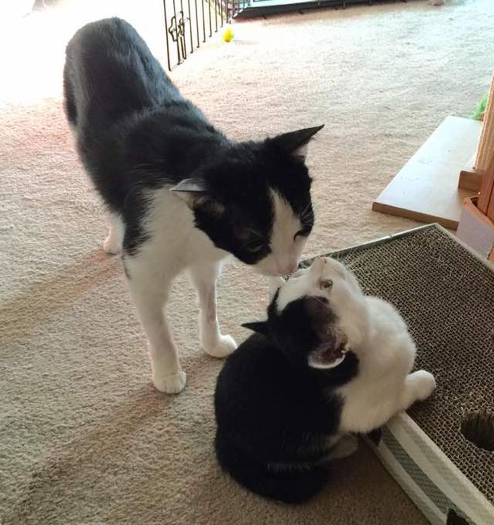 "Super Hero has taken Zeke under his wing and watches out for him like a little brother. If Zeke is going somewhere he isn't supposed to be, Hero herds him back into the room or redirects his attention by gently tapping him with his paw."