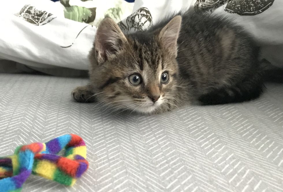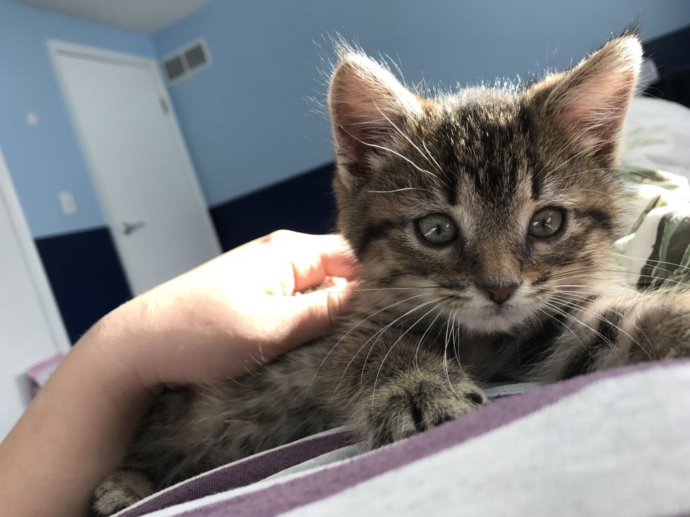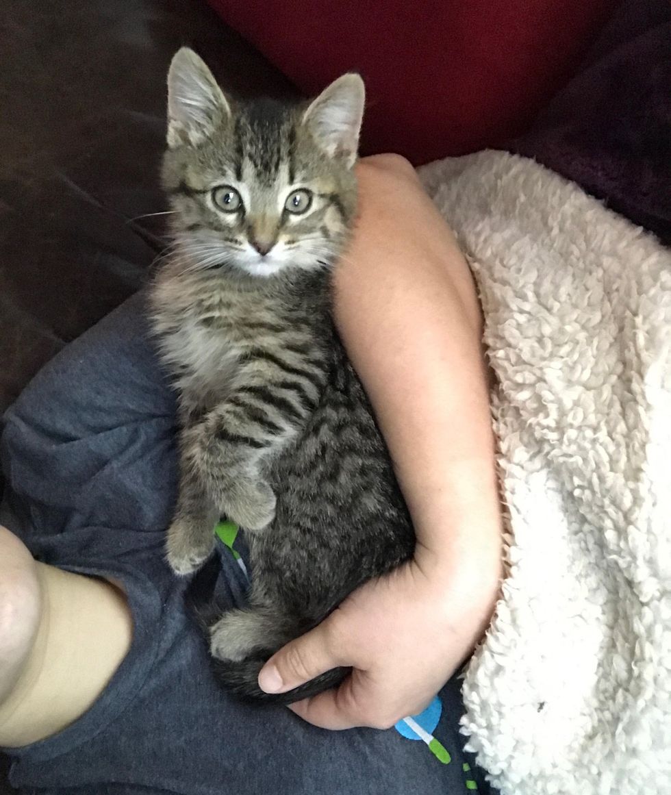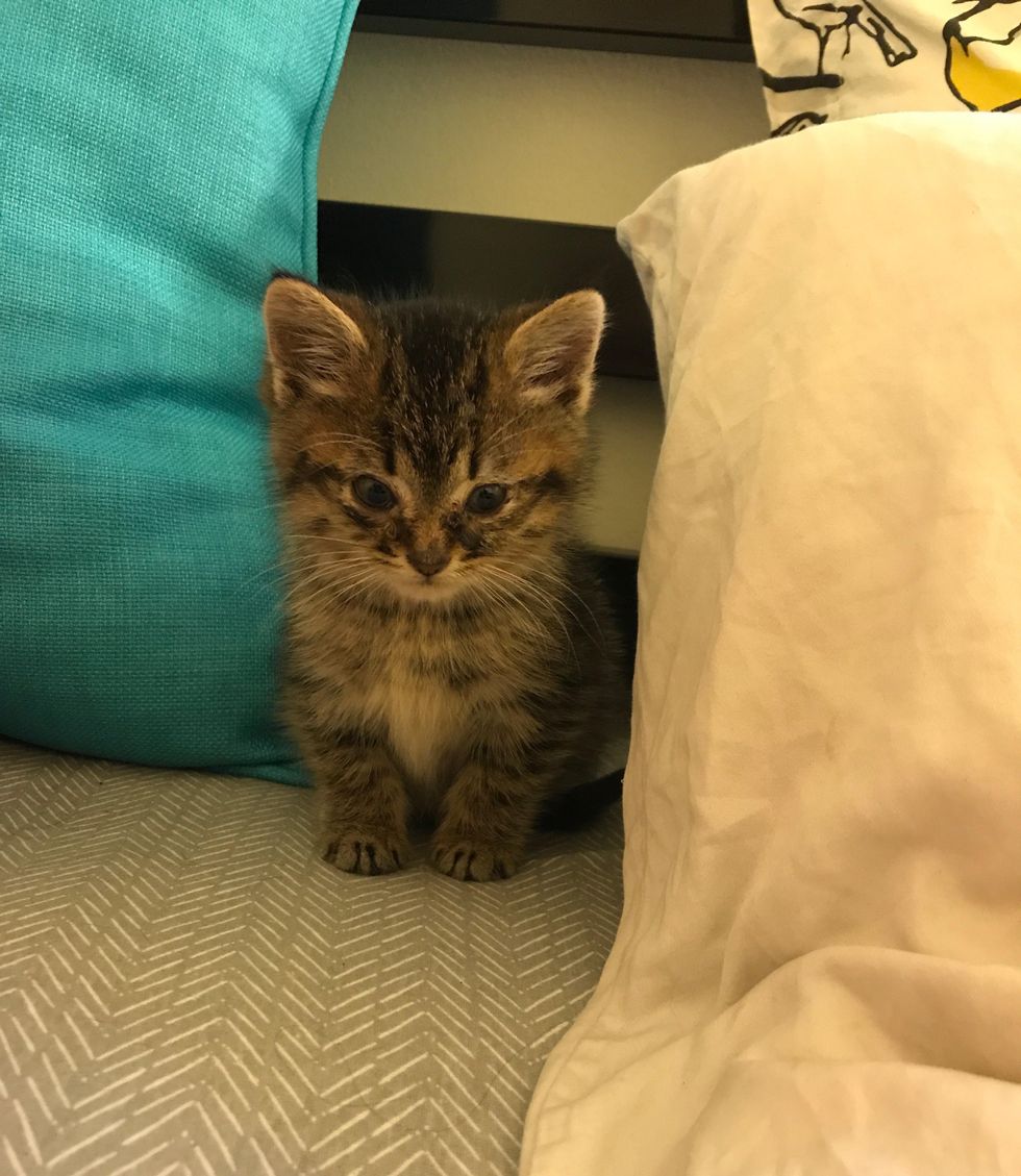 A young woman found a tabby kitten outside of her workplace one night, meowing for help.
