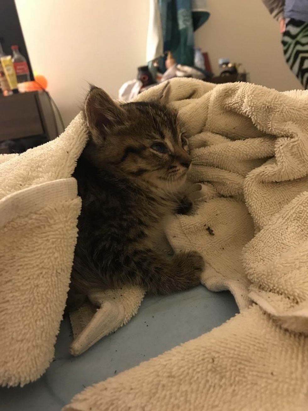 The kitten finally stopped fighting. She was exhausted from the cold and hunger. Jenna wrapped her in a towel, put her in a box and took the little one home.