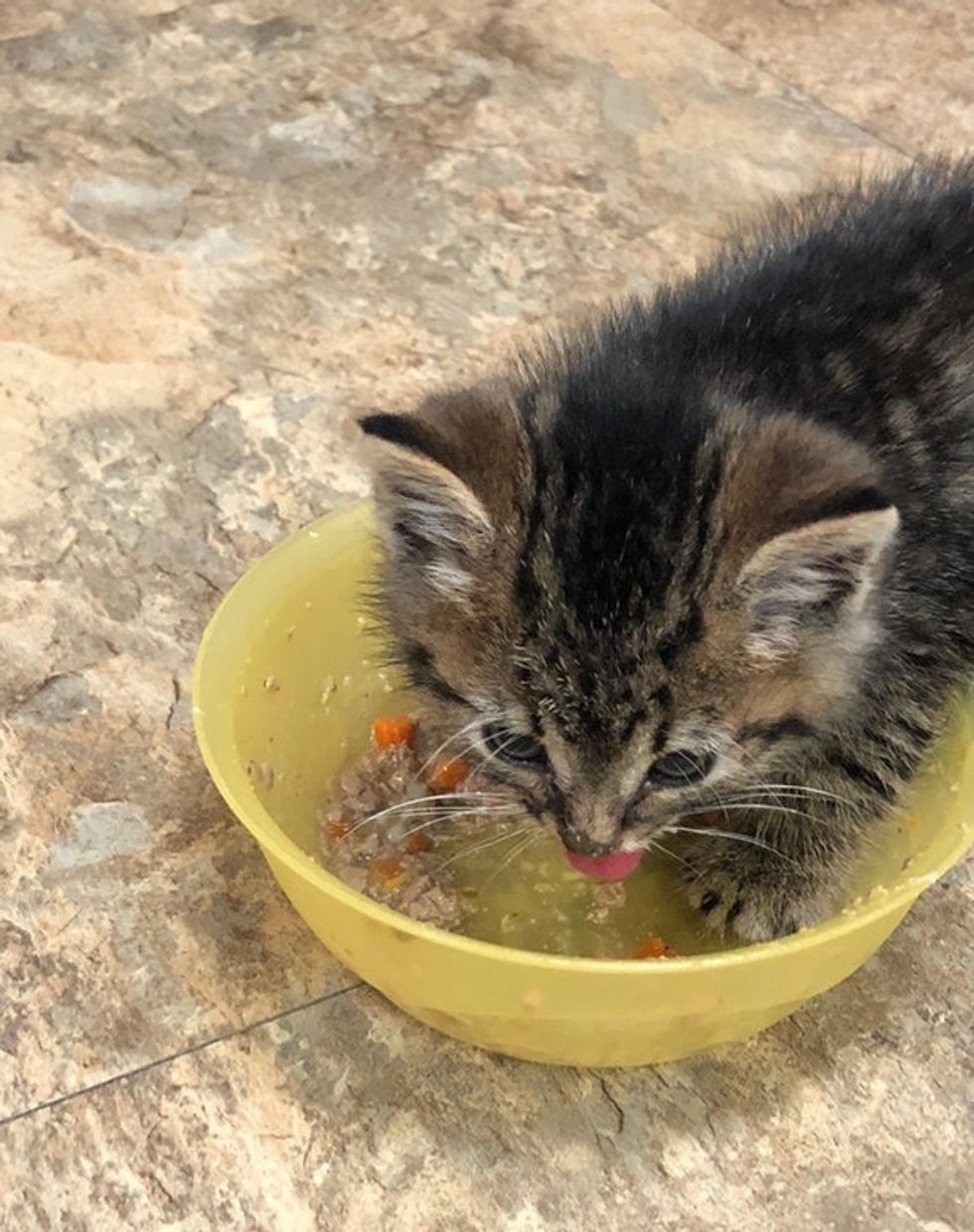 The kitten scarfed down her first meal at her new home. She was named Nugget.