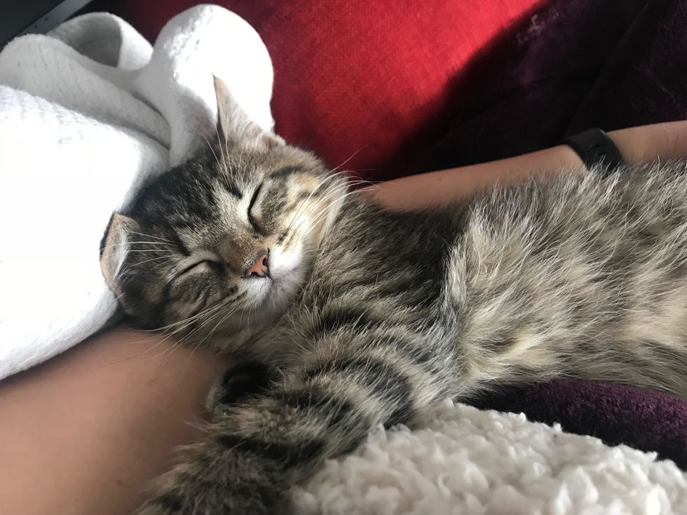 "She spent the nights on a heating pad and her days hiding under my bed, then one day she fell asleep in my hand while purring like a motorboat and was super affectionate from then on out!"
