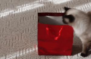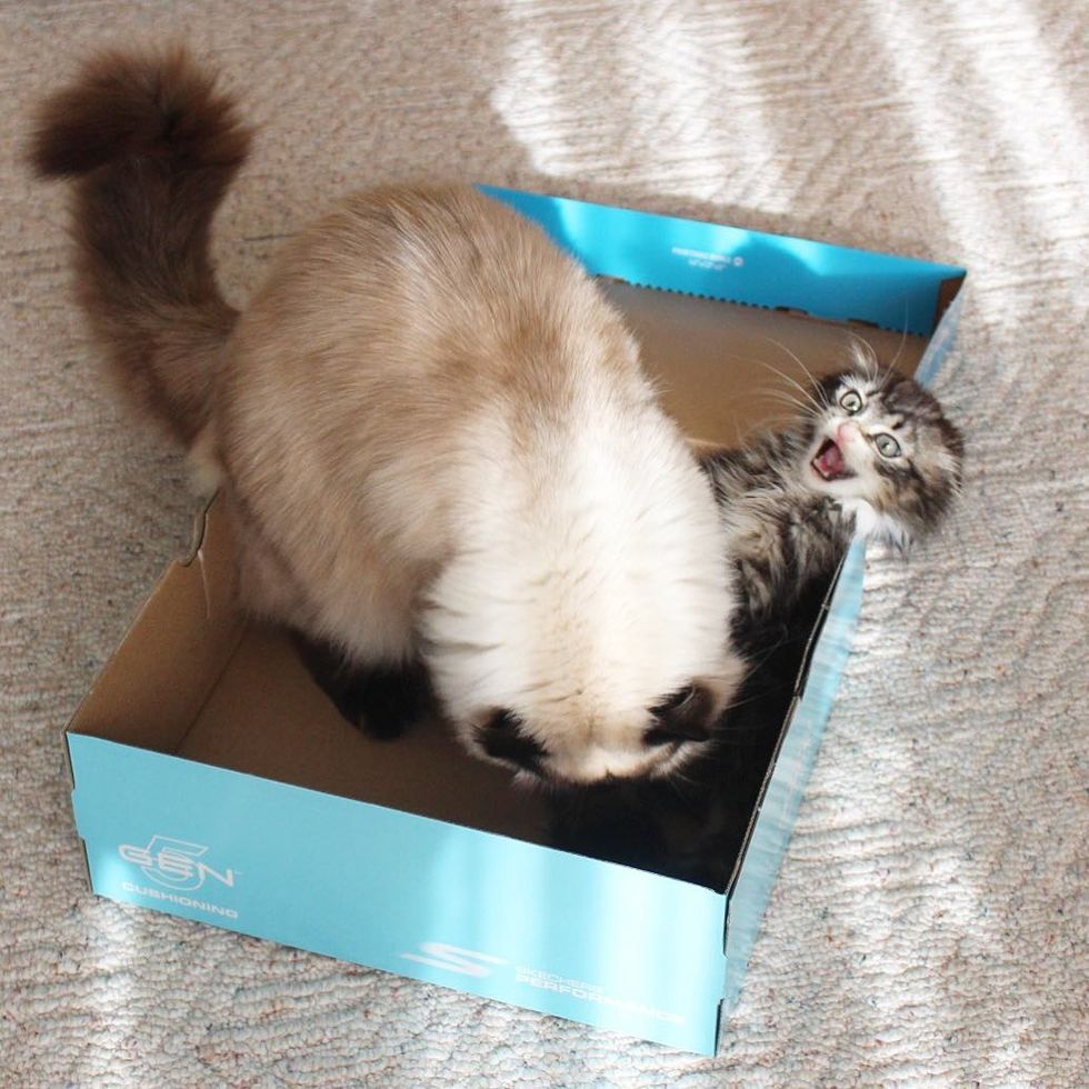 Sharing his favorite toy, the cardboard box, with the little tabby.