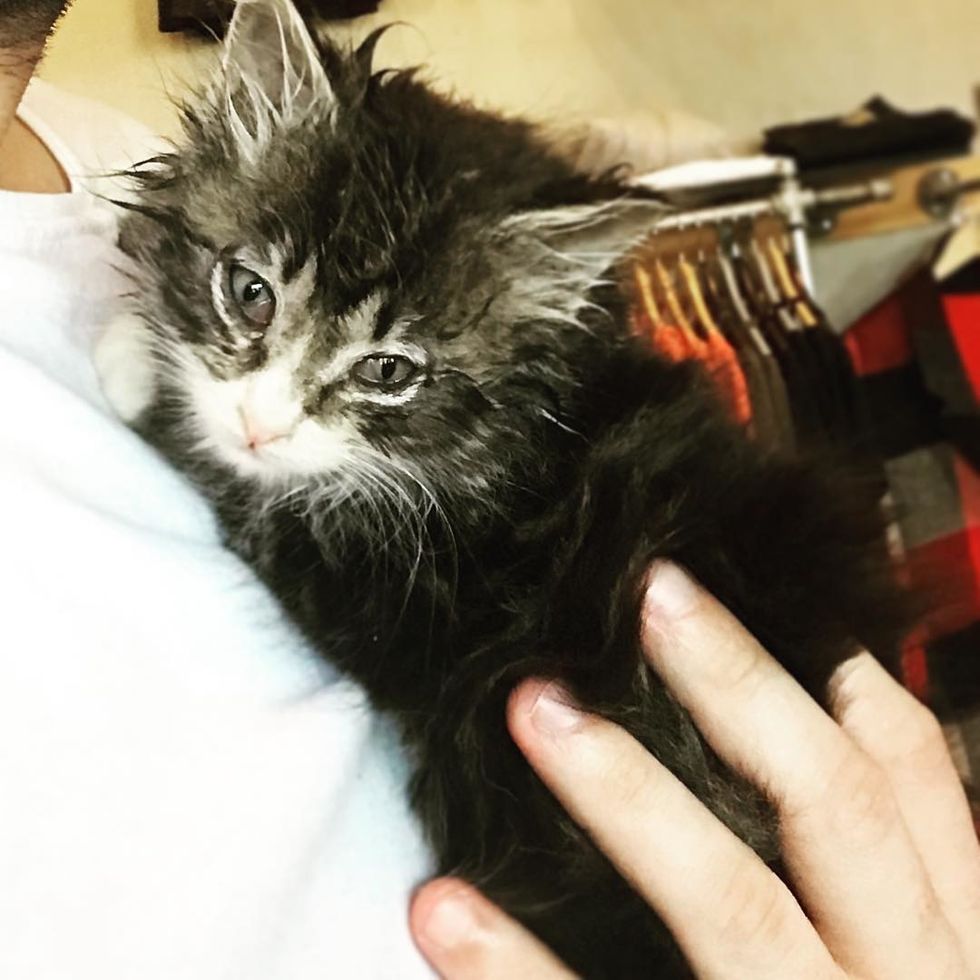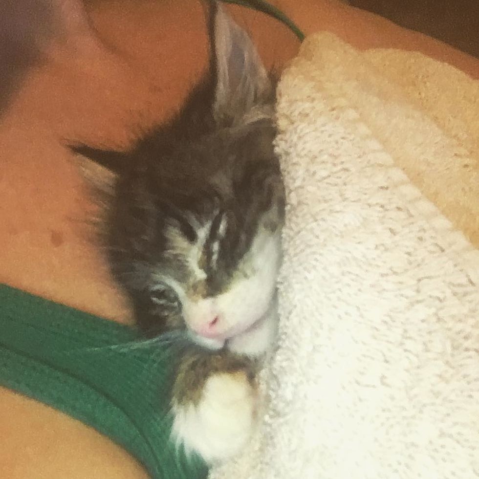 The little scraggly kitten moved into his new home. He curled up in his human's arms for that much-needed love and warmth. The sweet tabby became very attached to his human mom as she looked after him around the clock - fed him, cleaned him and kept him warm.