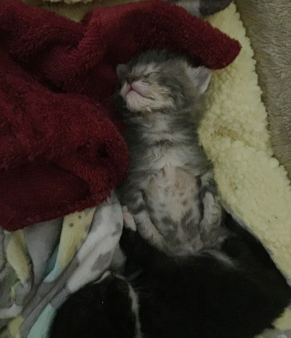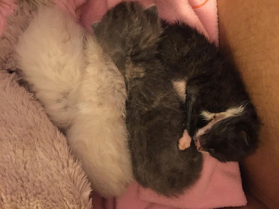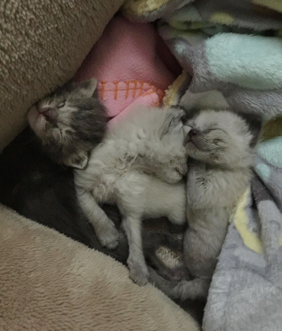 On day one, after a full meal, the kittens snuggled up for a nap.