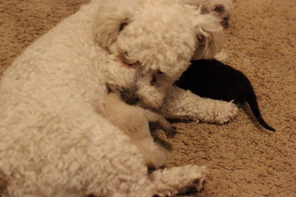 The tiny runt (left) cuddling with the biggest baby from the litter (right).