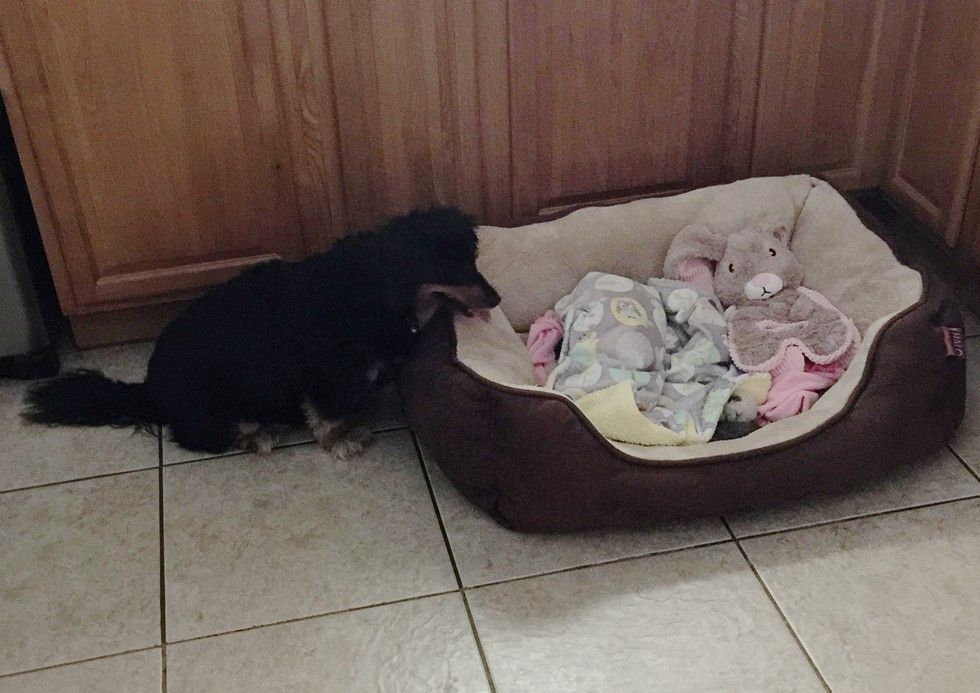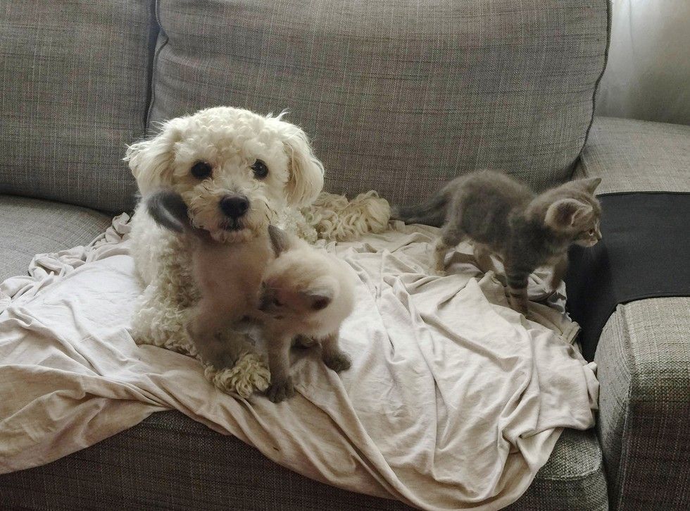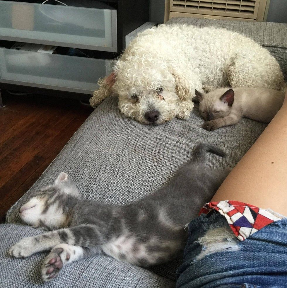 Mattie the dog is very protective, watching over her feline babies while they sleep.