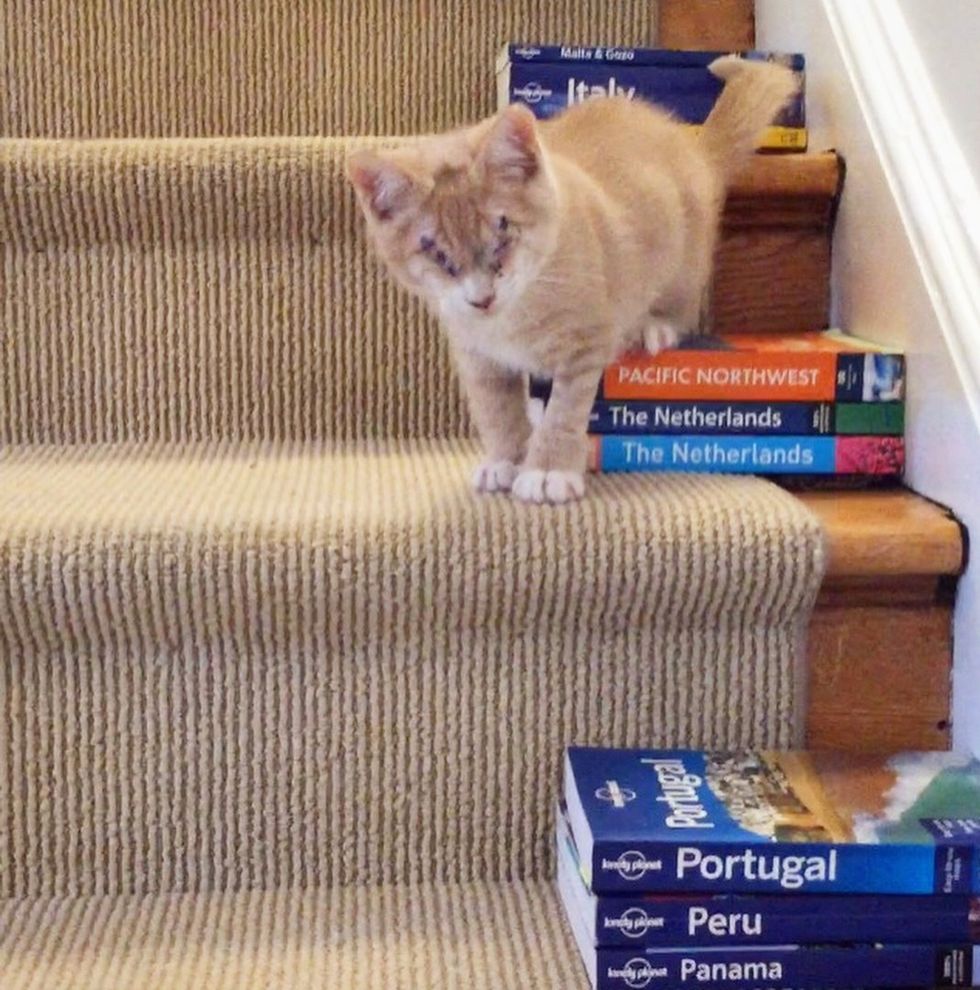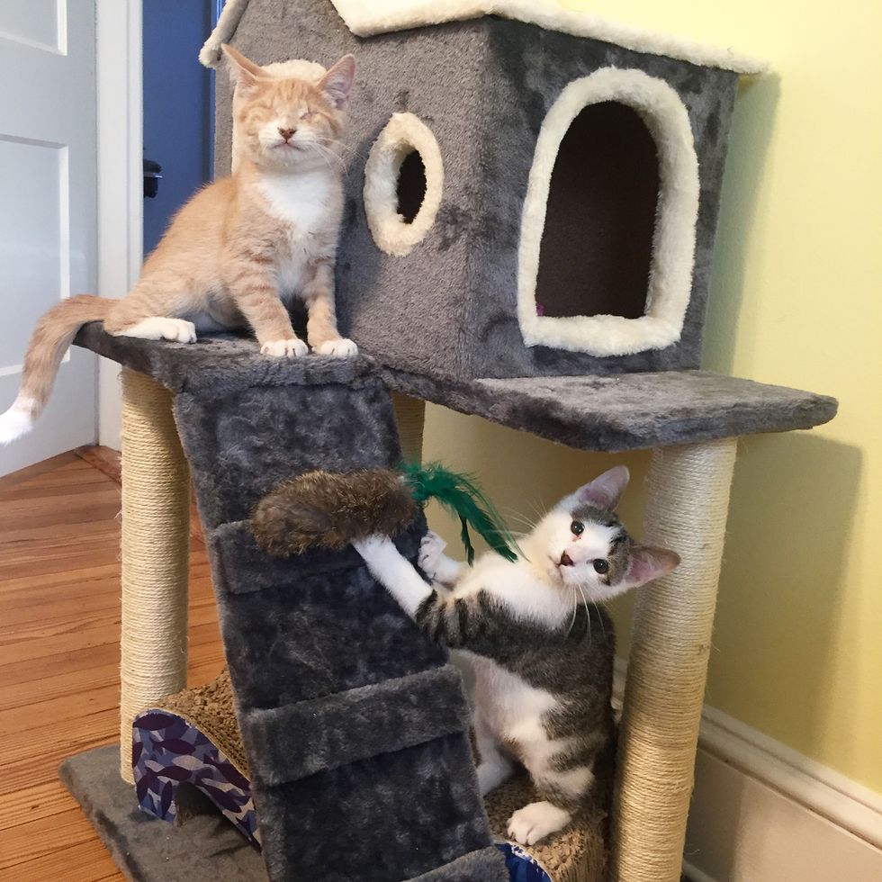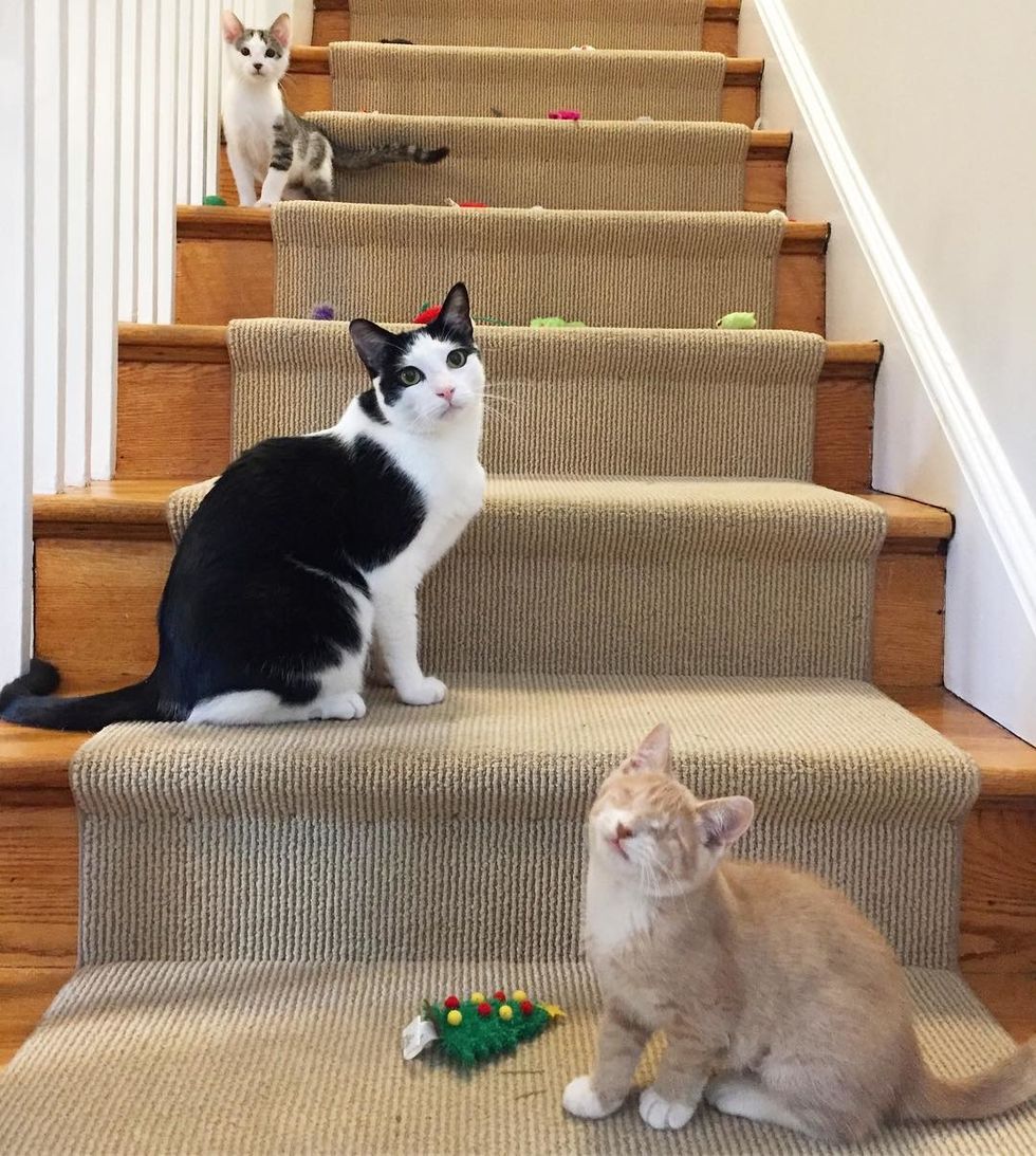 "Early on, we had to teach him how to use the stairs and get up on certain furniture, but now he zips up and down the stairs, climbs the cat tree, races around the house, and can find his favorite toys even when they get lost under furniture," Jen told Love Meow.