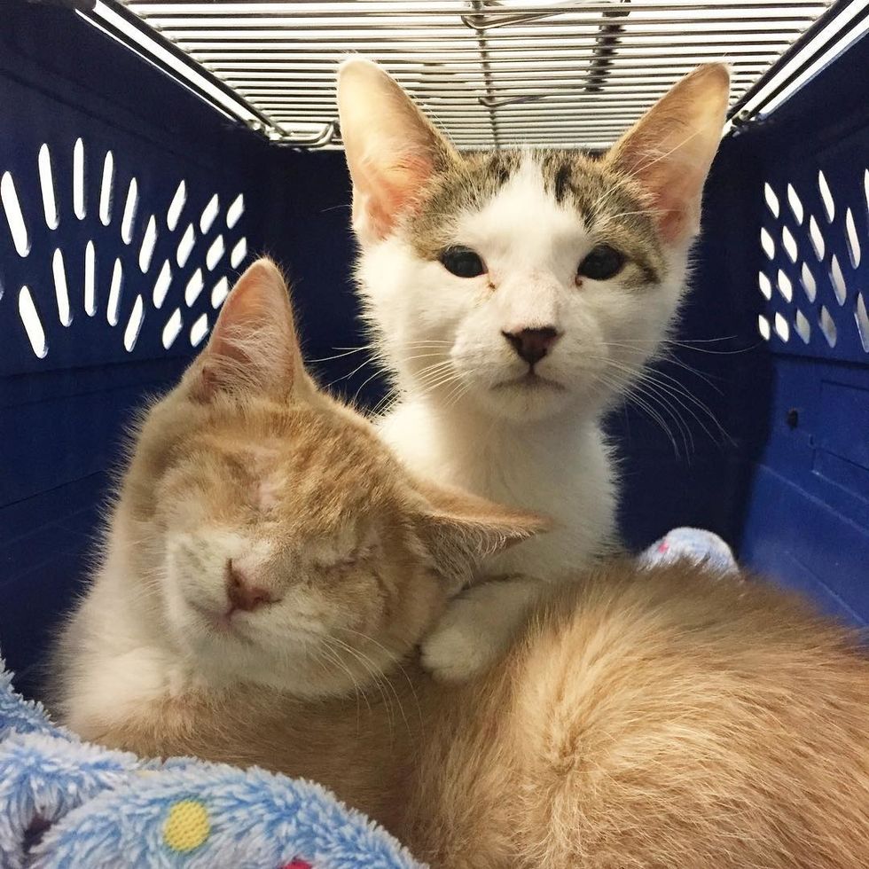 Two brother kittens were taken into a local shelter in Virginia at just a few weeks old. They were both born with congenital eye abnormalities. Jen, an avid fosterer/rescuer, saved the little ginger and came back to the shelter to find his brother.