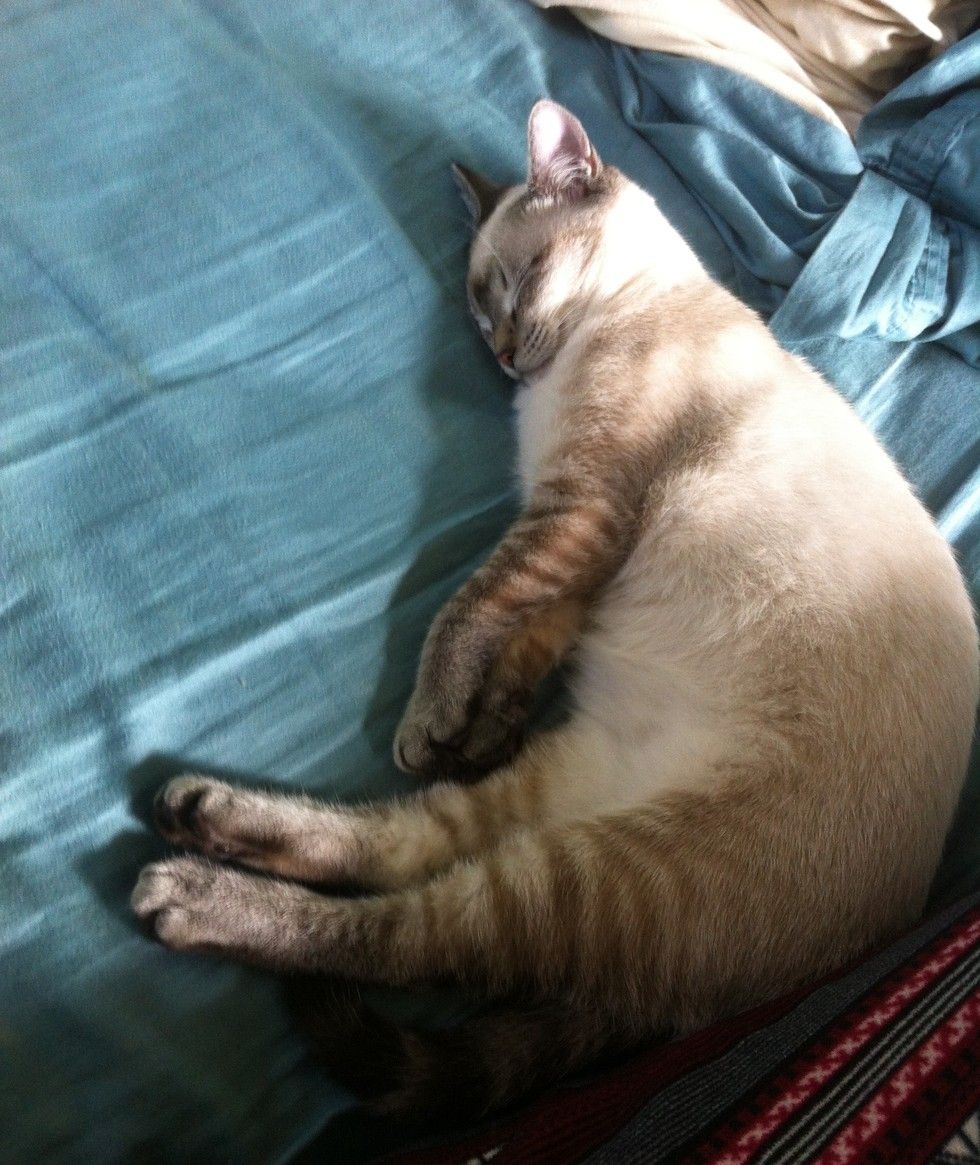 "I had told myself that I was going to get her spayed and release her, but by the 3rd night she was in our bedroom sleeping under the dresser, and on the 4th night, she slept in my bed between my legs and my boyfriend's legs, stretched out like she owned the place."