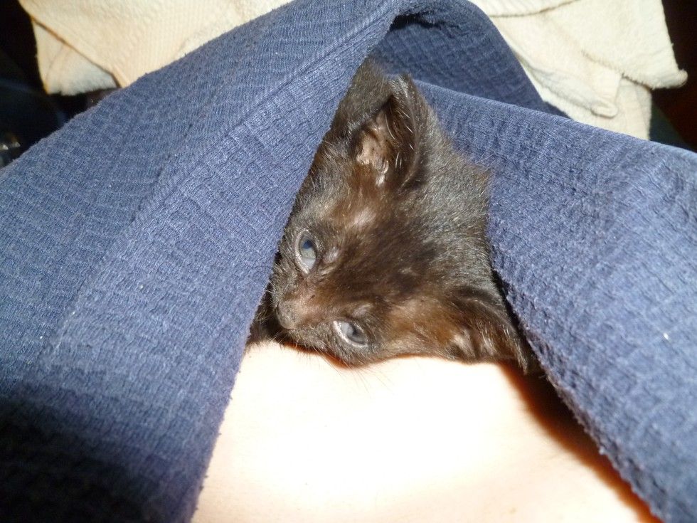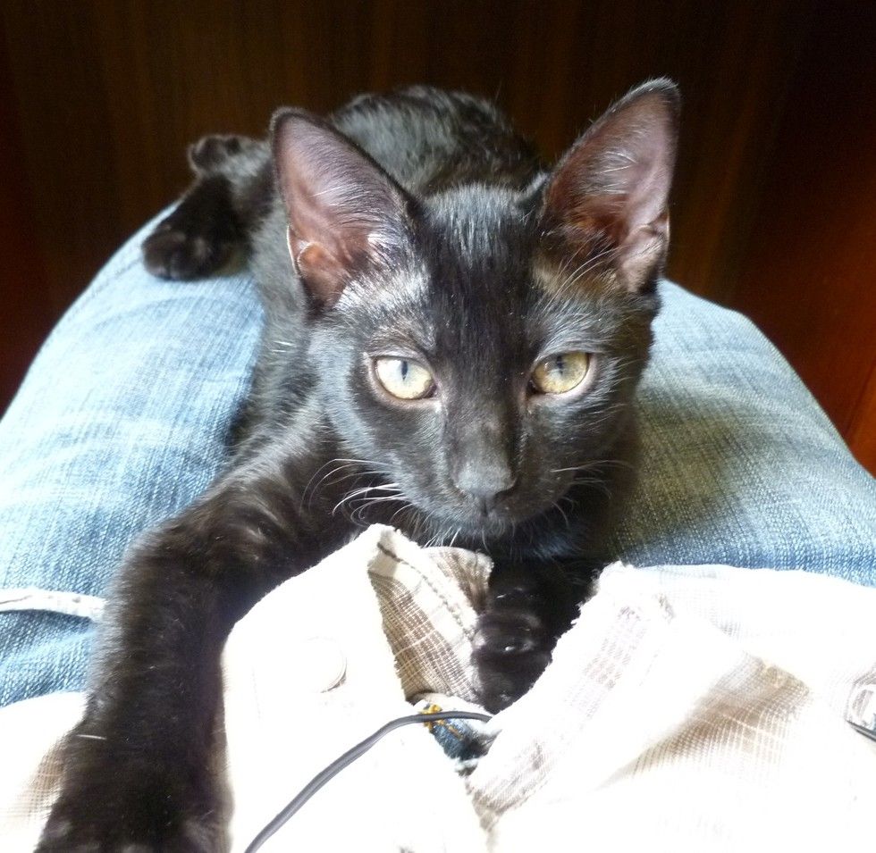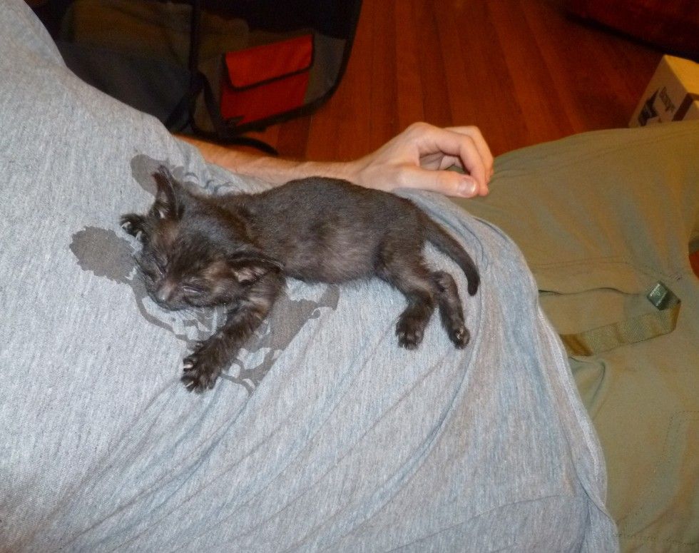 The black kitten became quite attached to her human dad and fell asleep on him.
