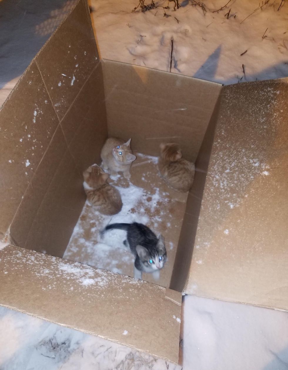 She was alerted by their meows and found them in the box on the road covered in snow. The kind lady brought the kittens inside so they could warm up, and it saved their lives.