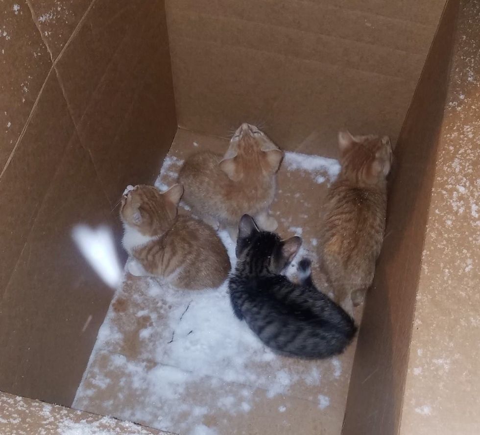 A kind woman found four little kittens abandoned in a box on the side of the road during a snow storm. She saved their lives.