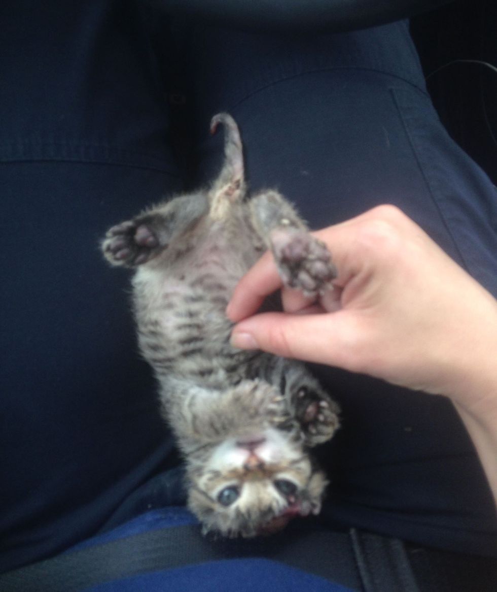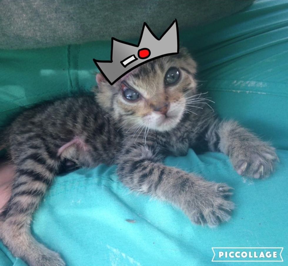 A tiny one month old kitten was found in a shed with a severe head injury. People were afraid to touch him, but a young woman stepped in, scooped him up and got him help.