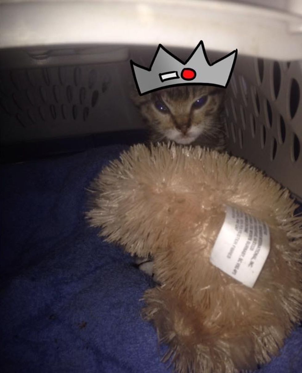 Trooper was found along with his siblings hiding with their mother in an old shed, but the little tabby boy was missing skin on top of his head.