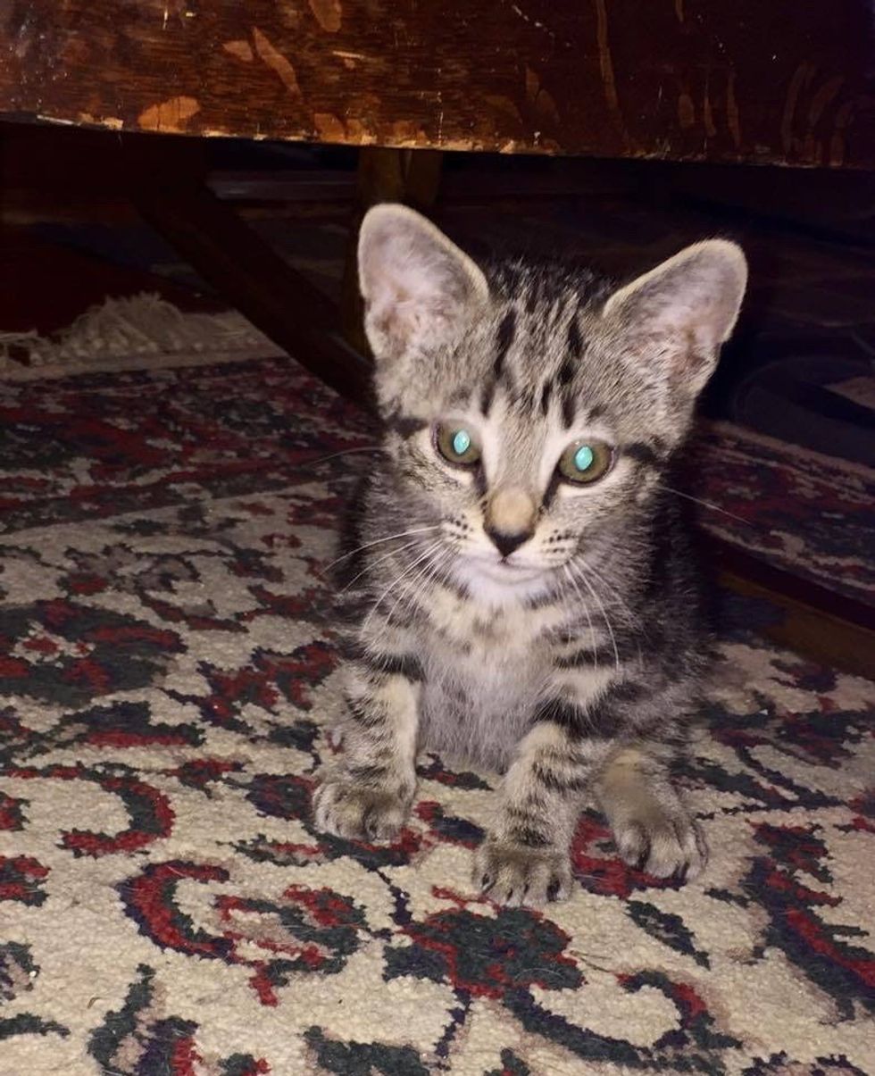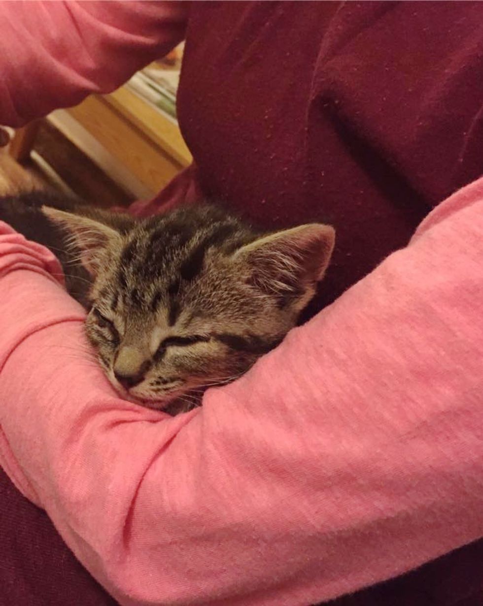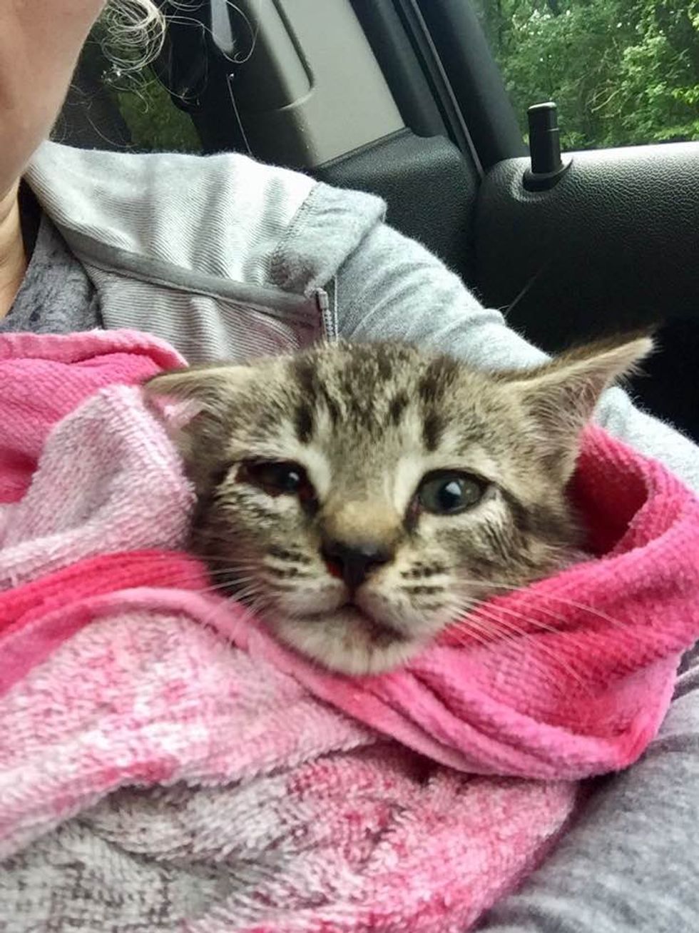 Christina Hamlett was driving down the highway (288 in Virginia) when she spotted a tiny, pitiful tabby kitten on the side of the road.