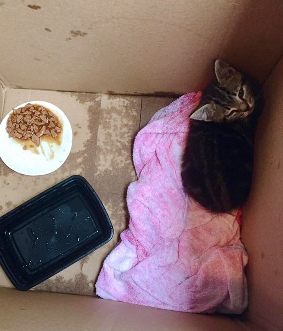 She gently picked up the terrified little kitten and wrapped him in a towel. As she held him in her arms and petted him on his head, the kitten calmed down as if he knew that he was finally safe.