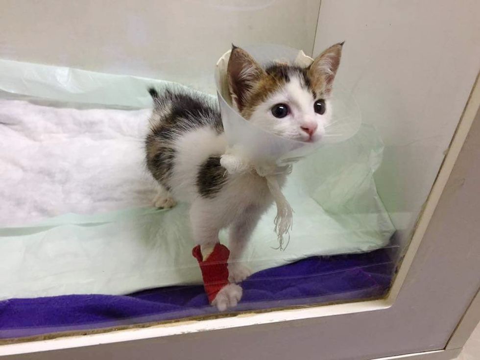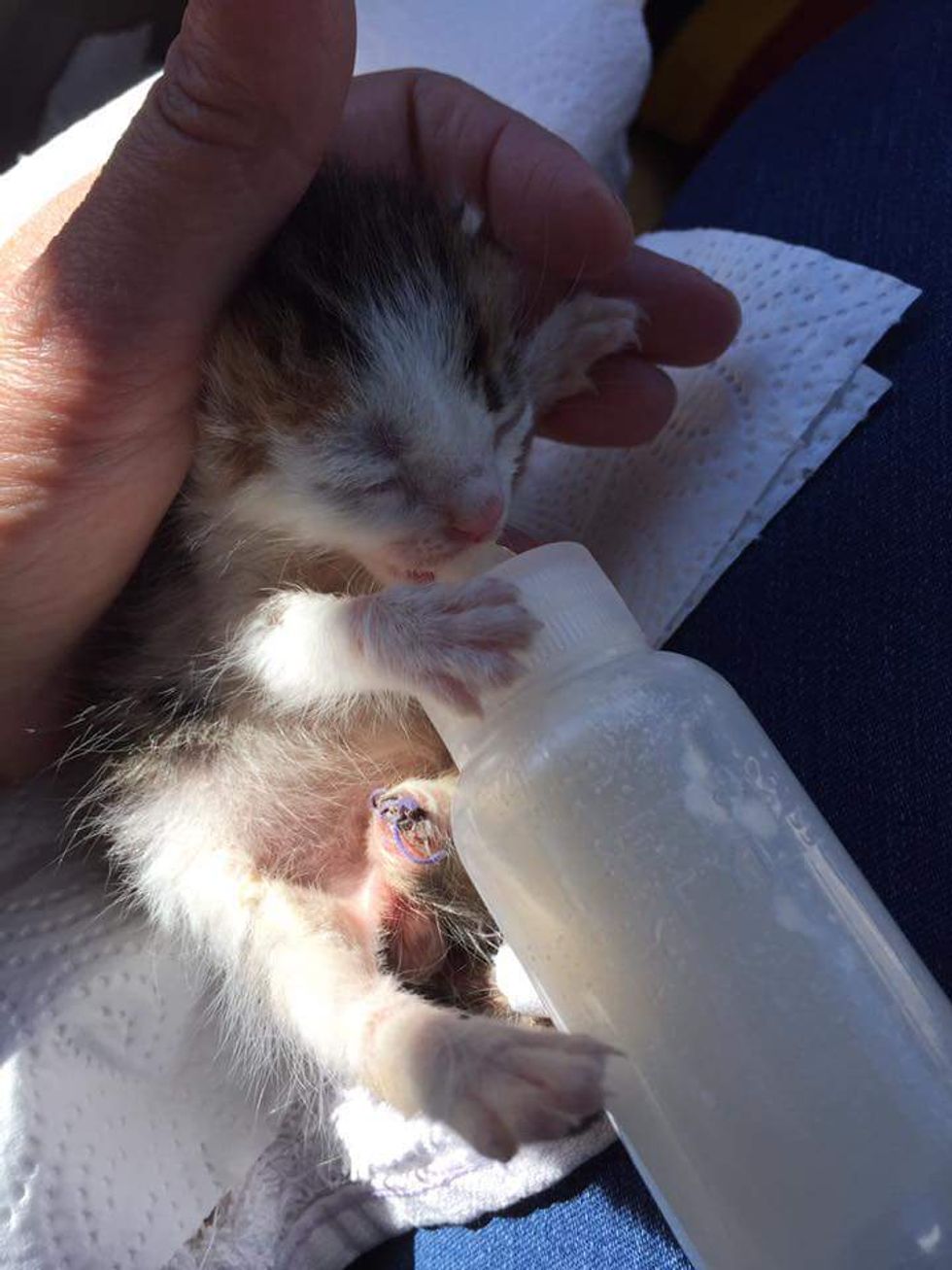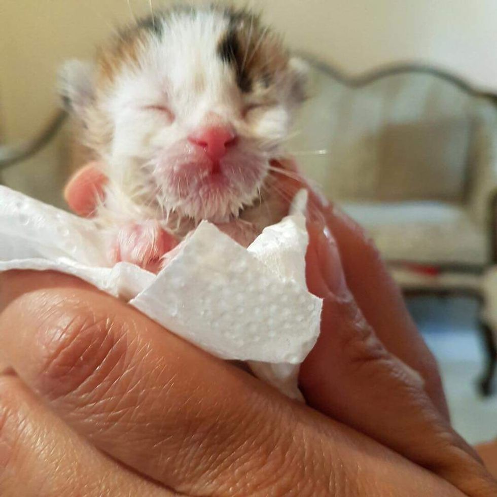 The kitten was crying for his mom who was nowhere in sight. He was barely one week old and had a bad paw and a broken leg. She took the baby home and started nursing him around the clock. Soon the little fighter bounced back and started putting on weight and gaining strength like a warrior.
