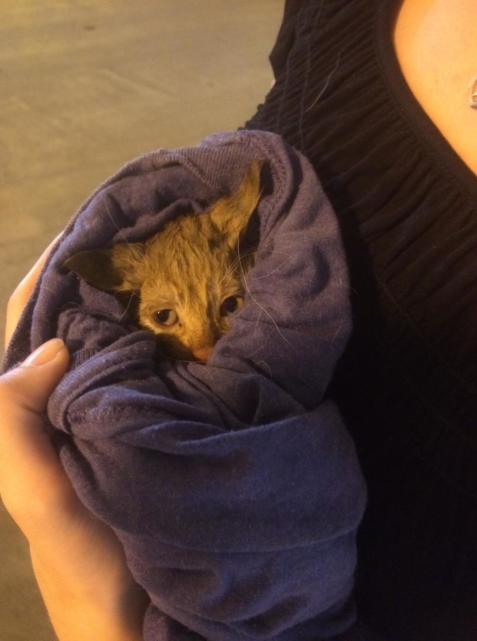 "At first, I couldn't even tell if he was a cat. Nevertheless, I picked him up. As I cradled him to my chest, he let out a little meow and I breathed a sigh of relief, thankful that he was alive. We wrapped him up in a spare t-shirt and went to the car," Katie told Love Meow.