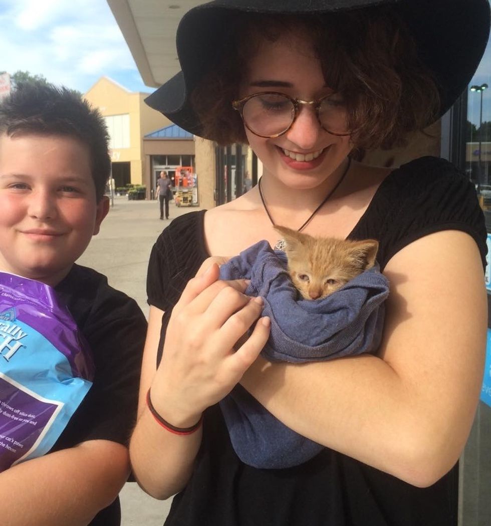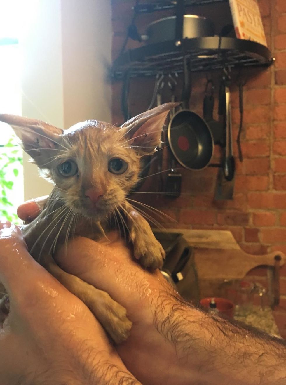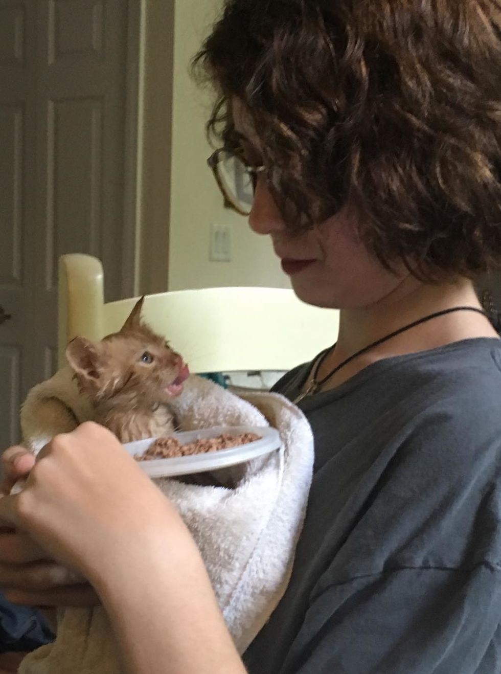 After a quick trip to the store to get supplies and food, they gave the kitten a bath to wash off all the fleas that were crawling over him.