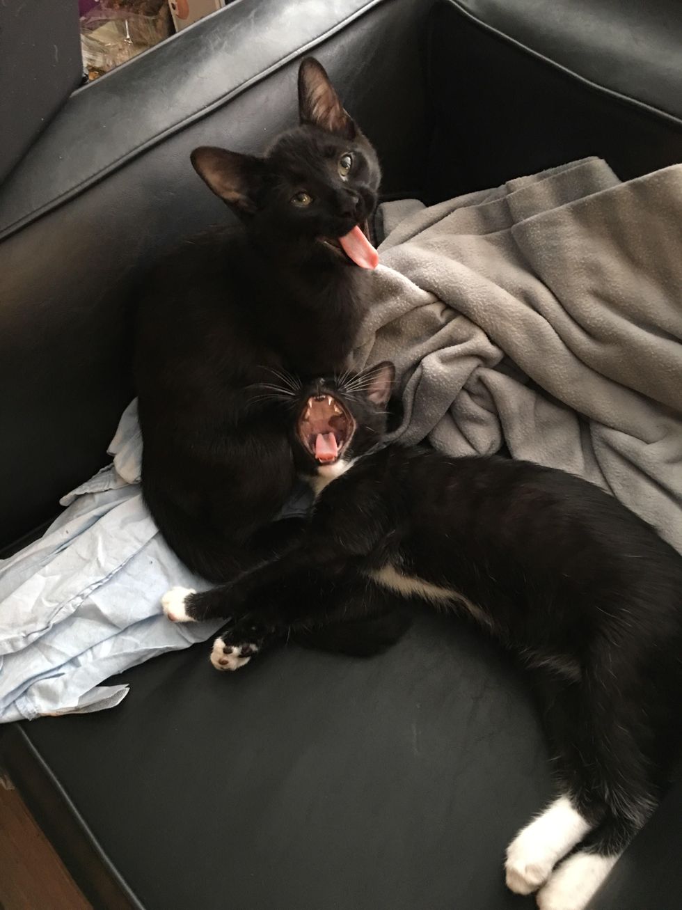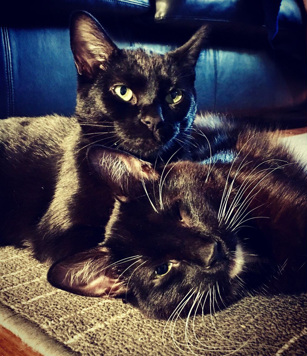 "They like laying on top of the dog, chasing the laser in tandem, singing the song of their people when Mom and Dad try having them sleep in another room."