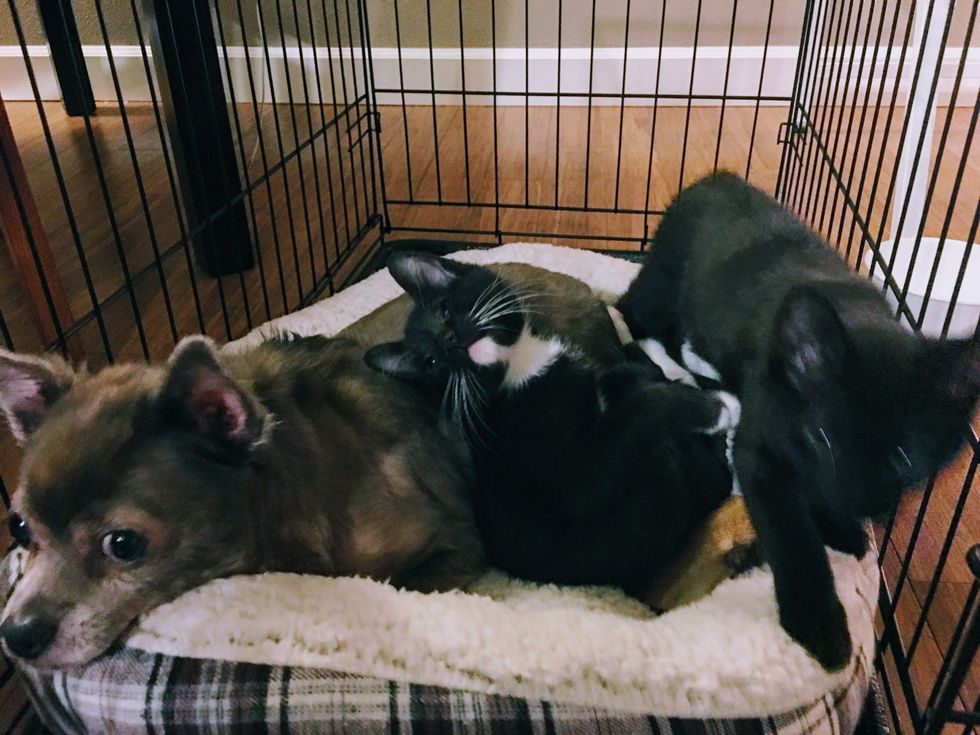 The feline siblings snuggled up to their new canine brother and decided to join him in his crate.