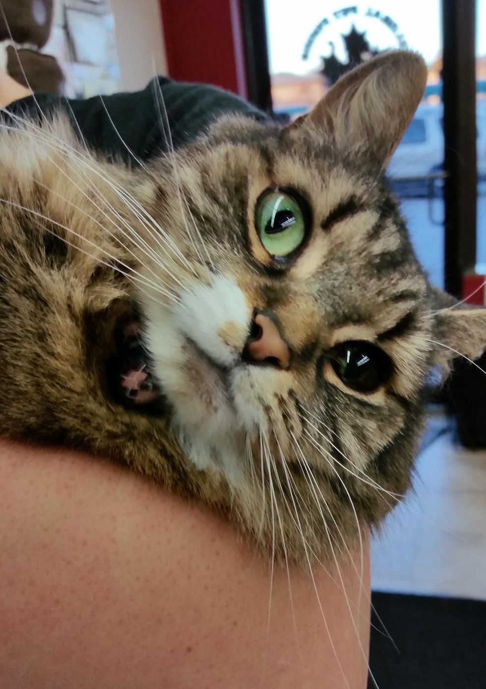Kat Von G couldn't leave her out there so took her into her shop, fed her and cleaned her up. For the first time, the kitty felt safe and loved. The next thing they knew the kitty decided that she would return the favor by helping her human run the store.