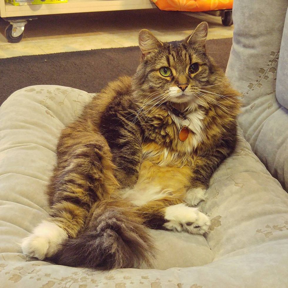 "I believe she's a Maine Coon and Persian mix, since Persians have copper eyes like that. The eye functions perfectly and close to the iris you can see speckles of the natural green peeking through," reddit user Tory_Rox told Love Meow.