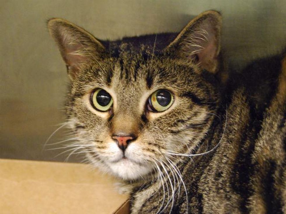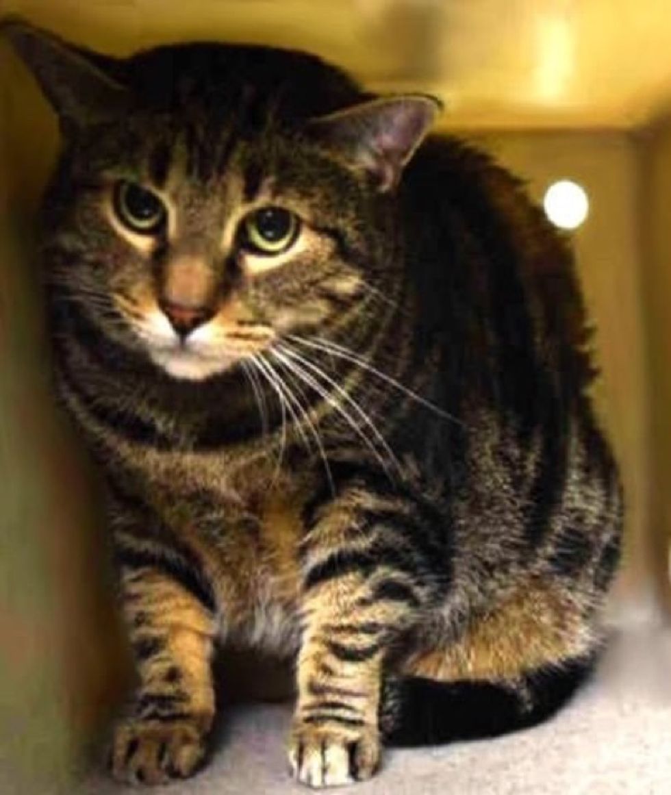 Ollie ended up at a high-kill shelter in New York City along with seven other cats from a hoarding situation. At six years old, the tabby cat was extremely timid, hiding in his box at the shelter most of the time.