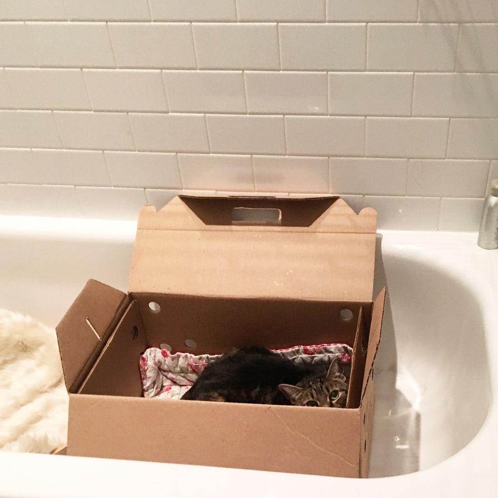 Sharon set up a little sanctuary for Ollie with a litter box, toys, a blanket, and plenty of food.