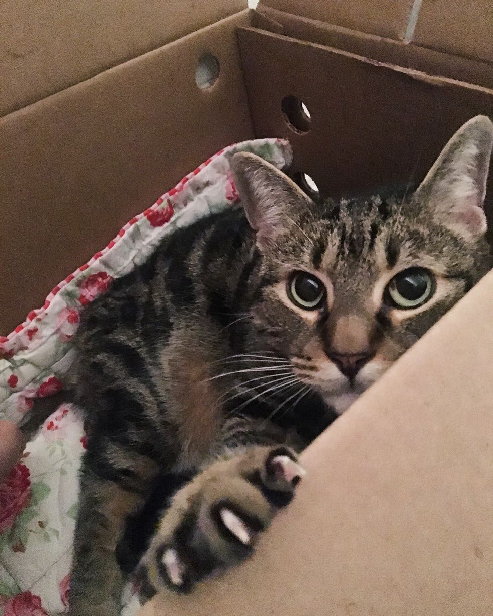Sharon took Ollie on his freedom ride home! "During the cab ride I peered into the box through the air holes and all I could see was a pair of big wide eyes staring back at me," she told Love Meow.