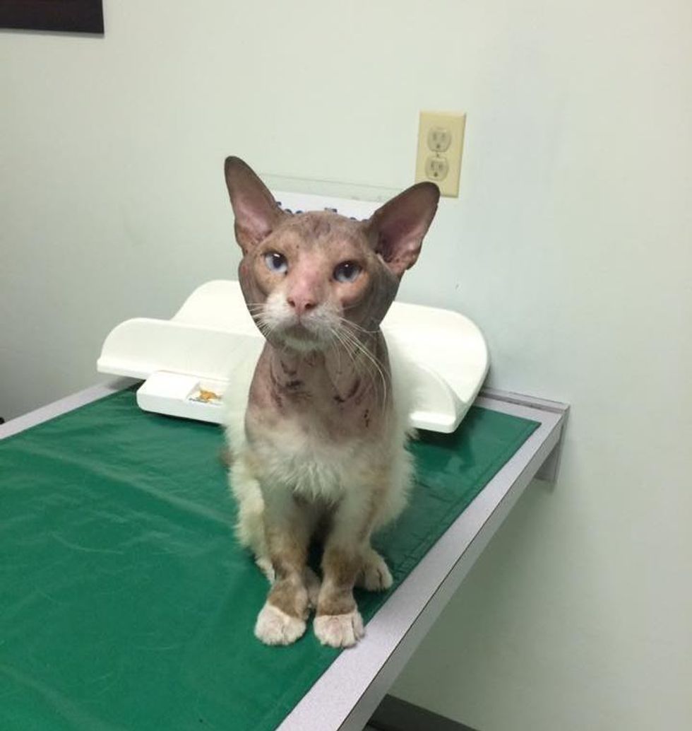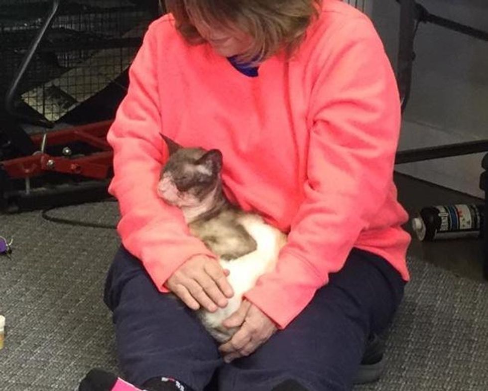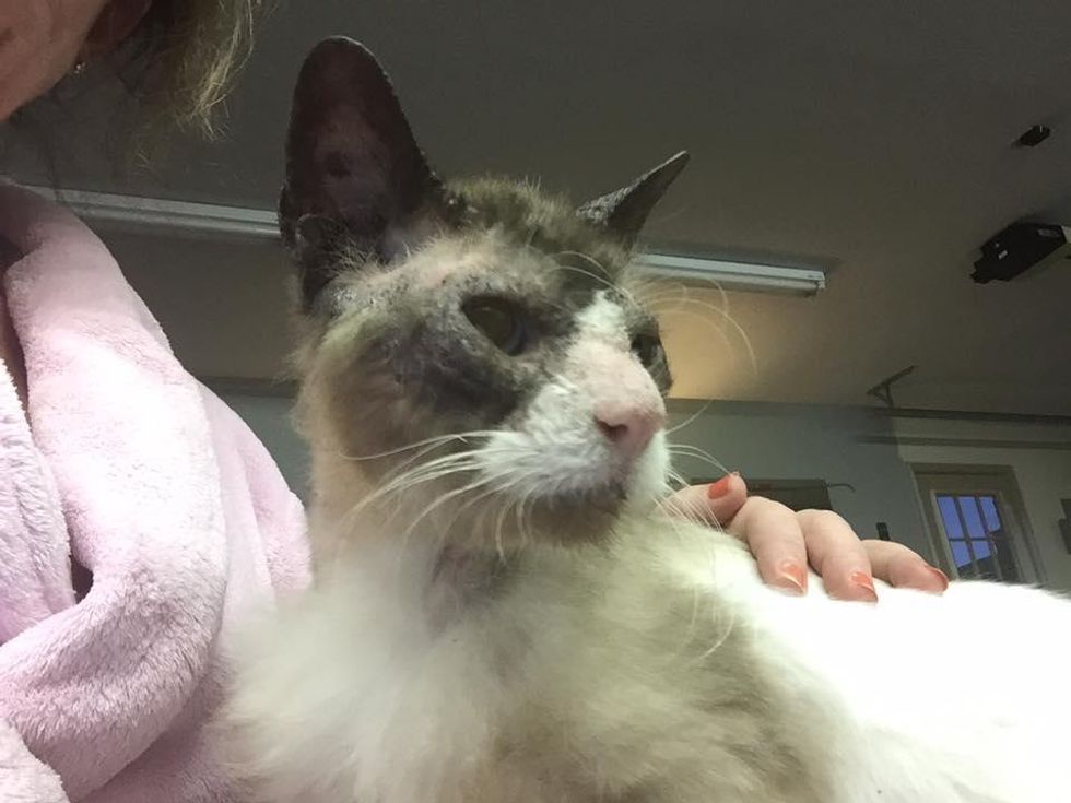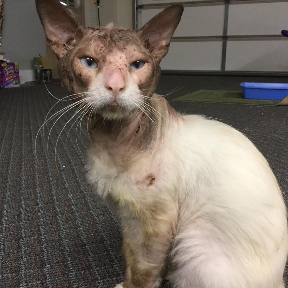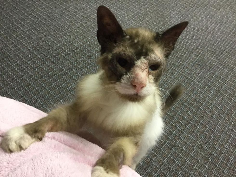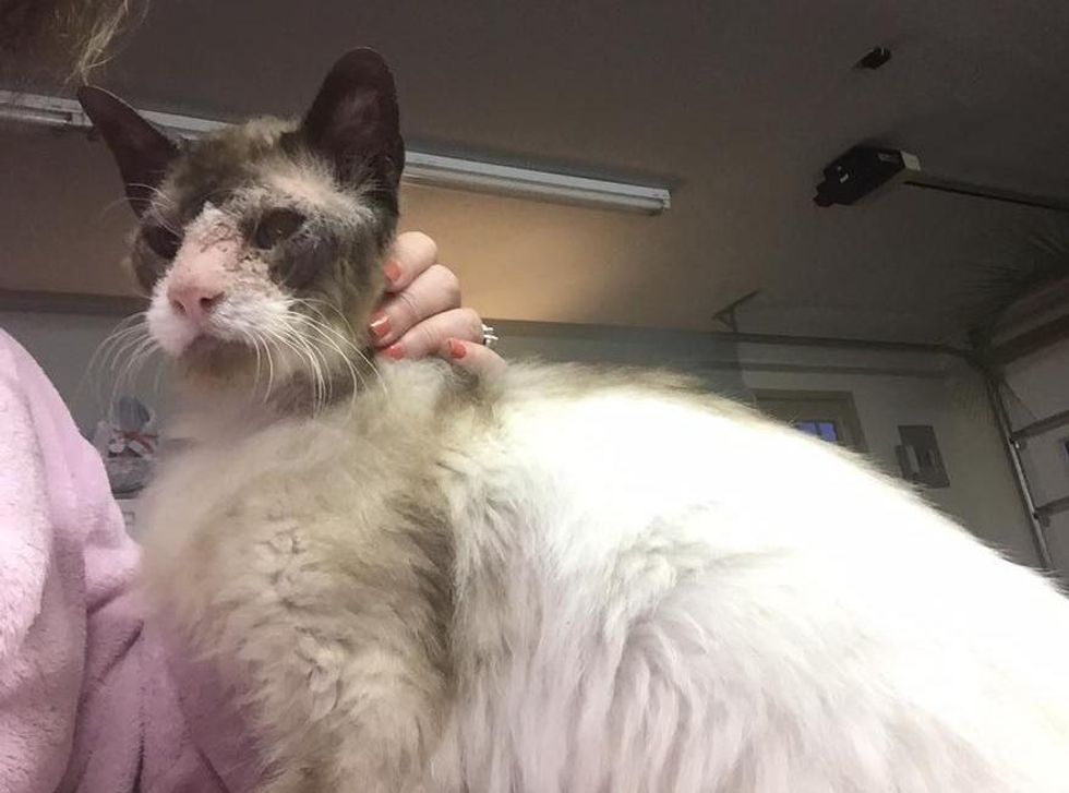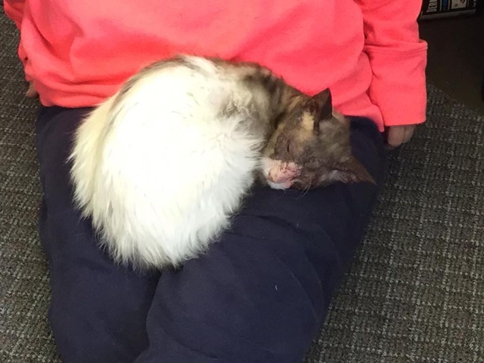 In August 2016, a staff member of James Madison University (in Harrisonburg, Virginia) found a sad looking Siamese cat on campus, wandering alone. Despite being in poor shape, he still meowed and sought attention. He let the good Samaritan pick him up and take him to the office where he devoured all the food he could eat and drank a lot of water.