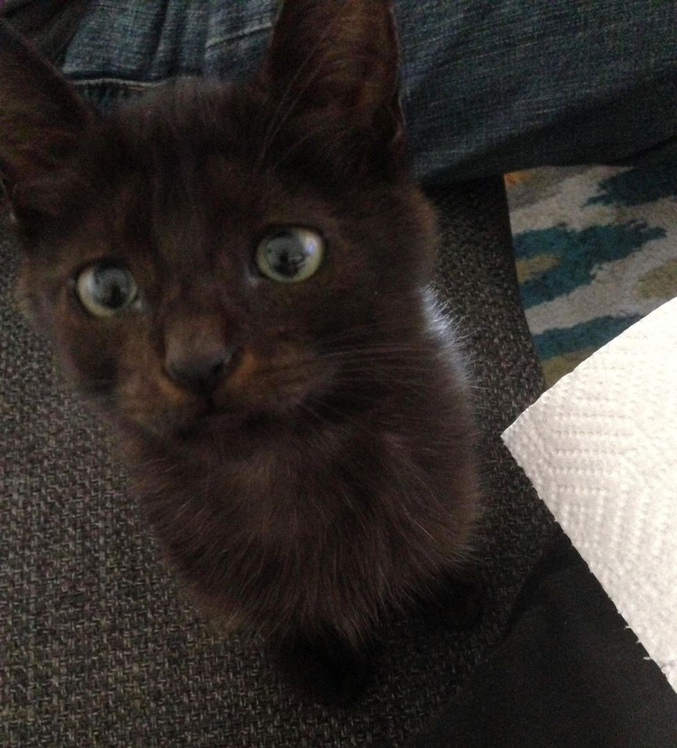 The hospital couldn't keep a stray kitten with no vaccinations. "I grabbed her, put her on my shoulder, and agreed to take her... We nicknamed her Squeaks because her meow sounded like a creaking door."