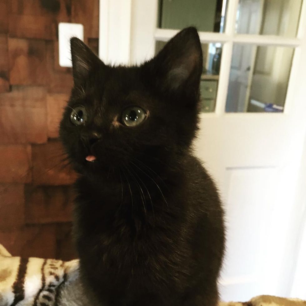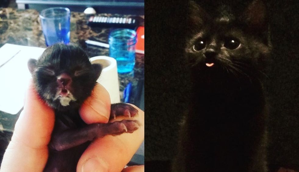 A tiny kitten, who was so small at birth that her own mother rejected her. Against all odds, the micro baby not only survived but thrived with a cute blep - tongue sticking out.