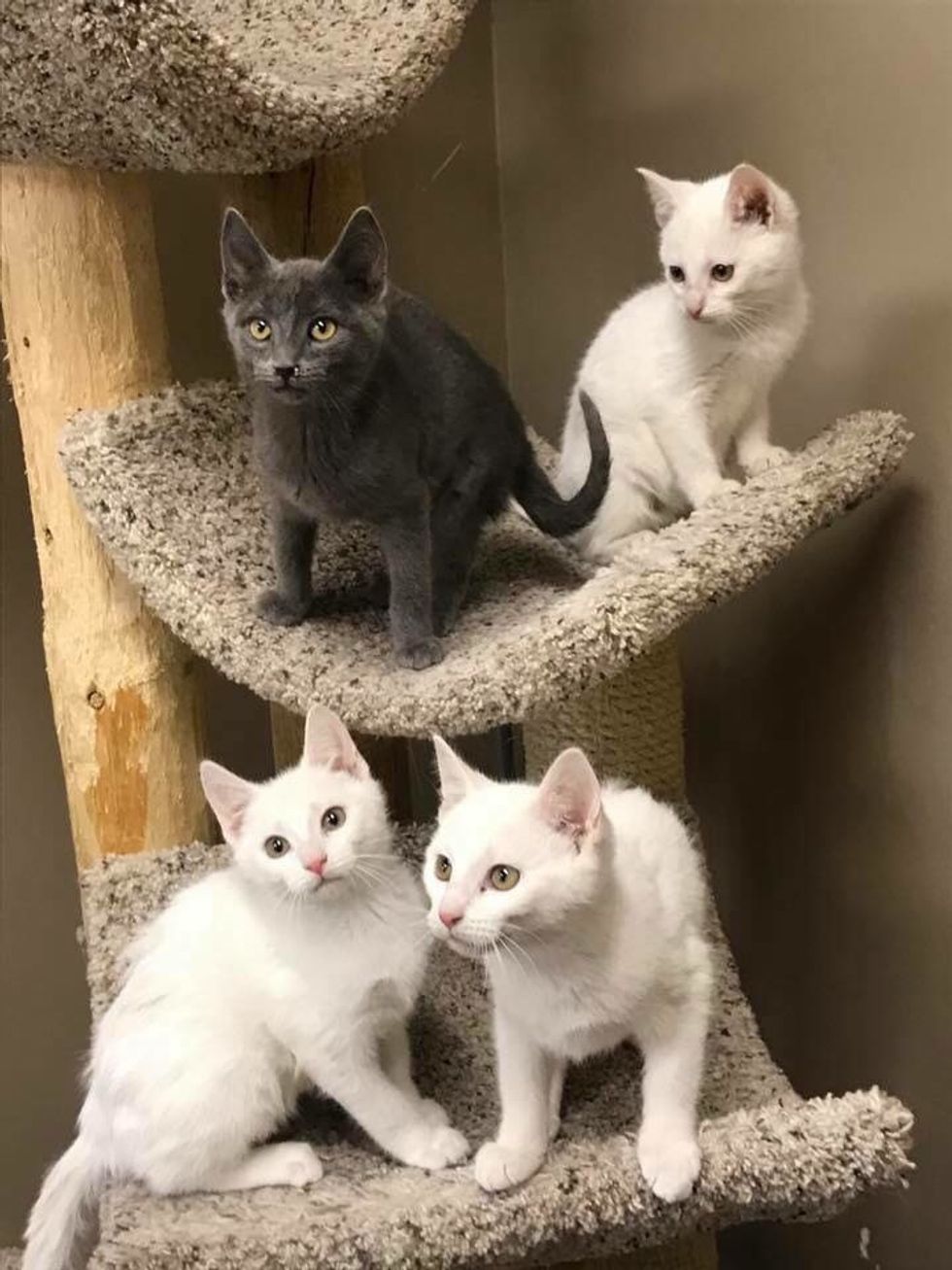 Here Kitty Kitty Rescue in Elkhart, Indiana was contacted about the four feline brothers. There were three white ones and a gray one.