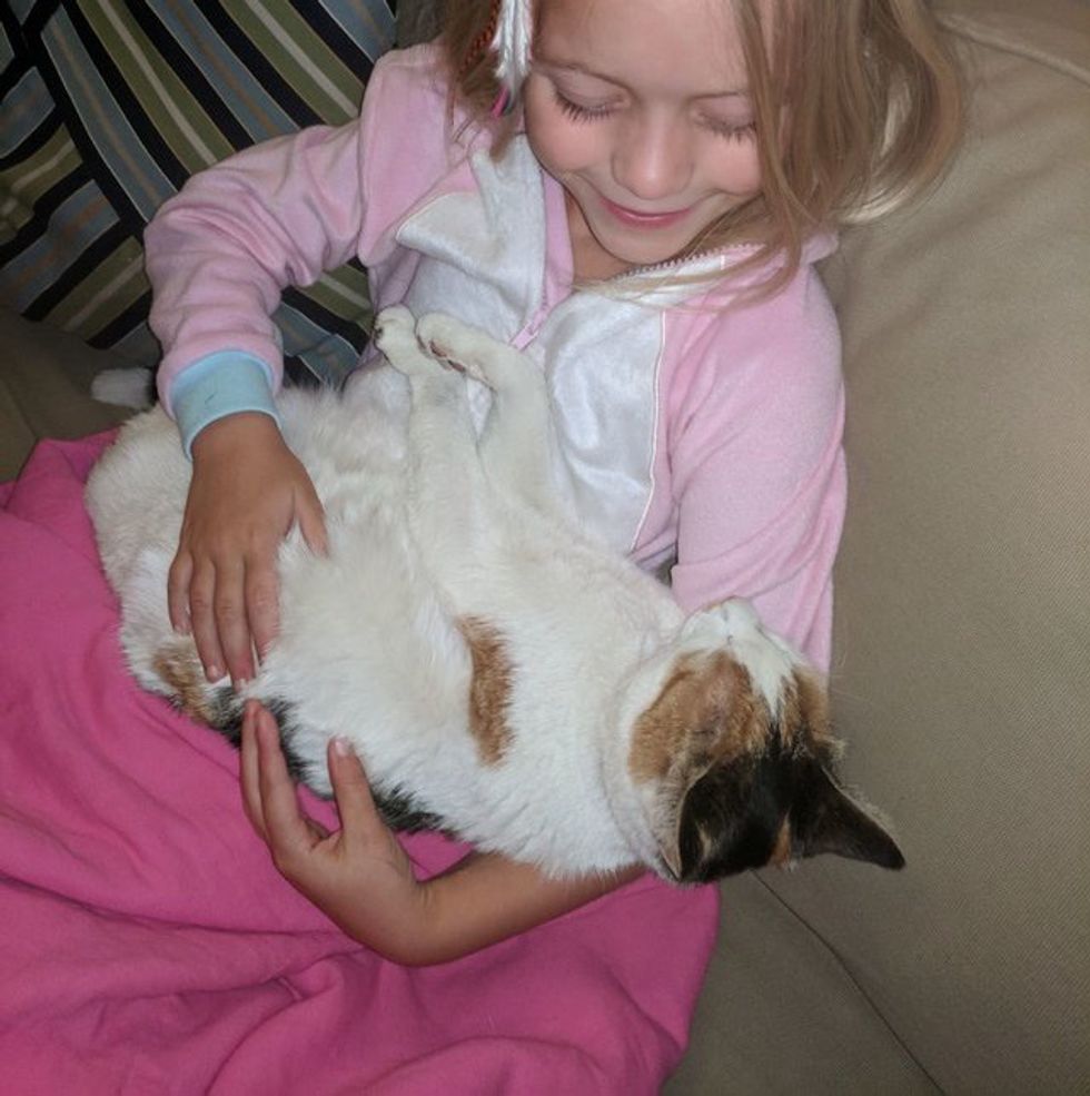 Laura's daughter cuddles with her kitty, making up for lost time.