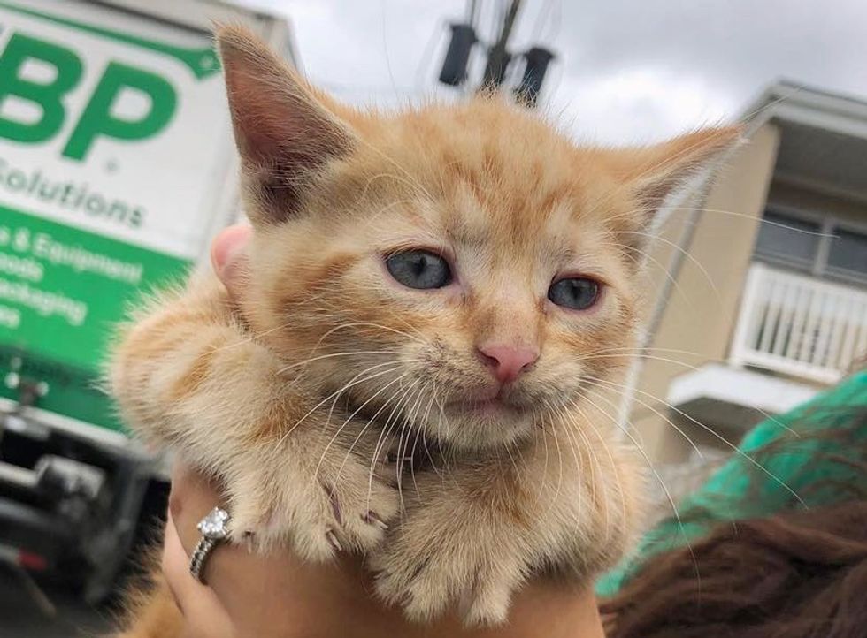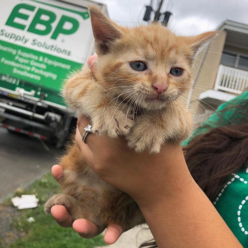 "The kittens were hiding under the trailer but the workers reached for them," Sofia said. "One of the orange kittens had a little trouble with balance."