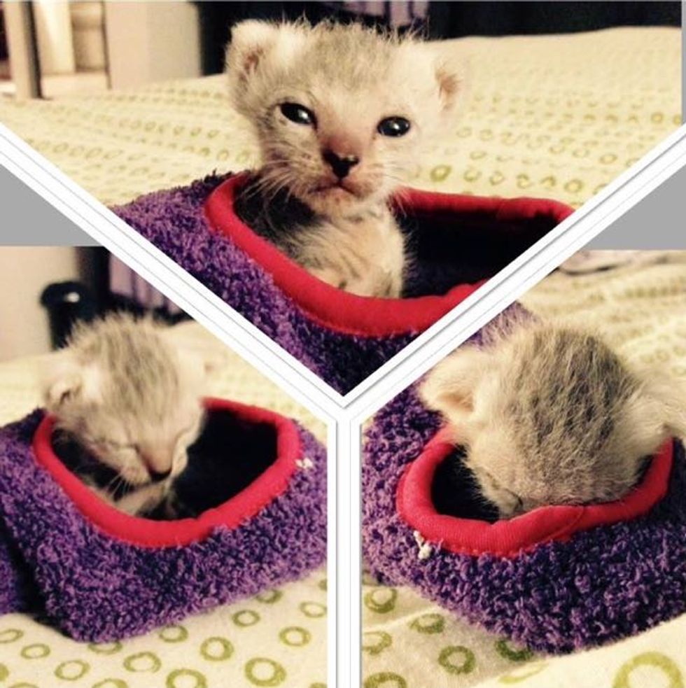 He found a fuzzy sock and decided to curl up in there for a nap.